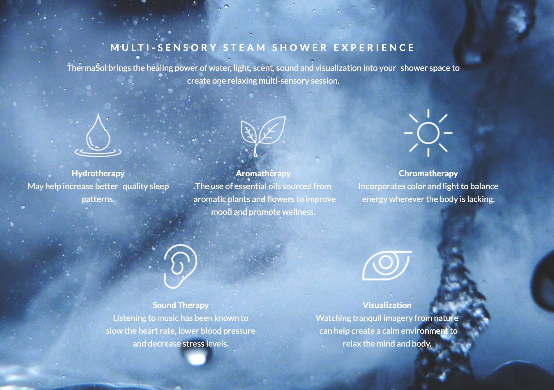 With nine unique scenes to choose from, ThermaSol's Tranquility mode combines imagery and sound themes from nature to help create a totally immersive steam shower experience. Accessed and viewed on ThermaTouch and integrated with Serenity Light, Sound, Rainhead.