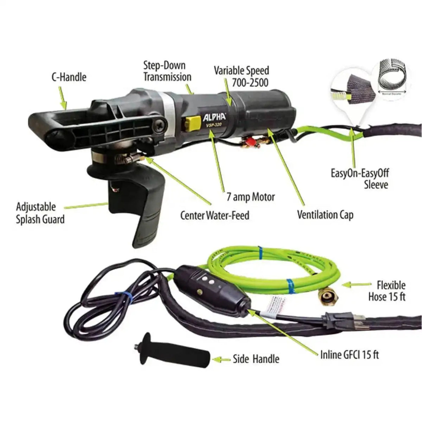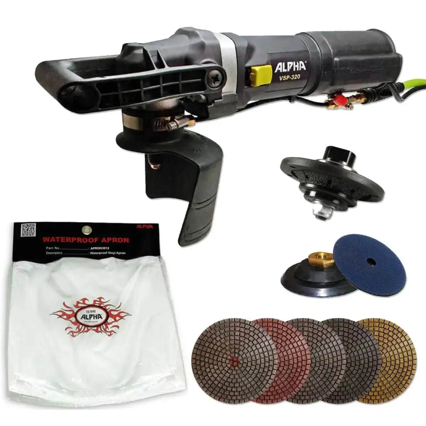 The Alpha Tile Bullnose Kit has everything you need to create a bullnose edge on tile or stone and polish it to a factory-quality finish. The kit includes the Alpha VSP-320 variable-speed polisher, 3/8" profile wheel, 4" flexible rubber backer pad, 5 Ceramica EX diamond polishing pads (200, 500, 1,000, 2,000, and 3,000 grit), and an apron. The kit also includes a DVD that shows the kit in action and other related products. Alpha warrants the VSP320 against defects in material and workmanship for 90 days from the date of the original retail purchase. If your Alpha power tool(s) are defective or inoperable, they must be returned to Alpha Tool for inspection. This is the standard policy for all new (out of the box) and used Alpha power tools. Alpha will inspect your item(s), and a determination will be made on how to proceed with the warranty process.