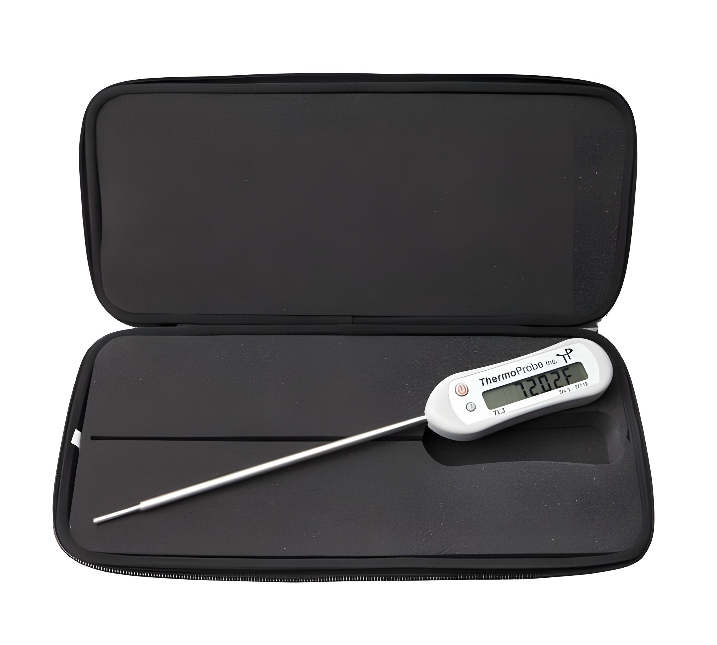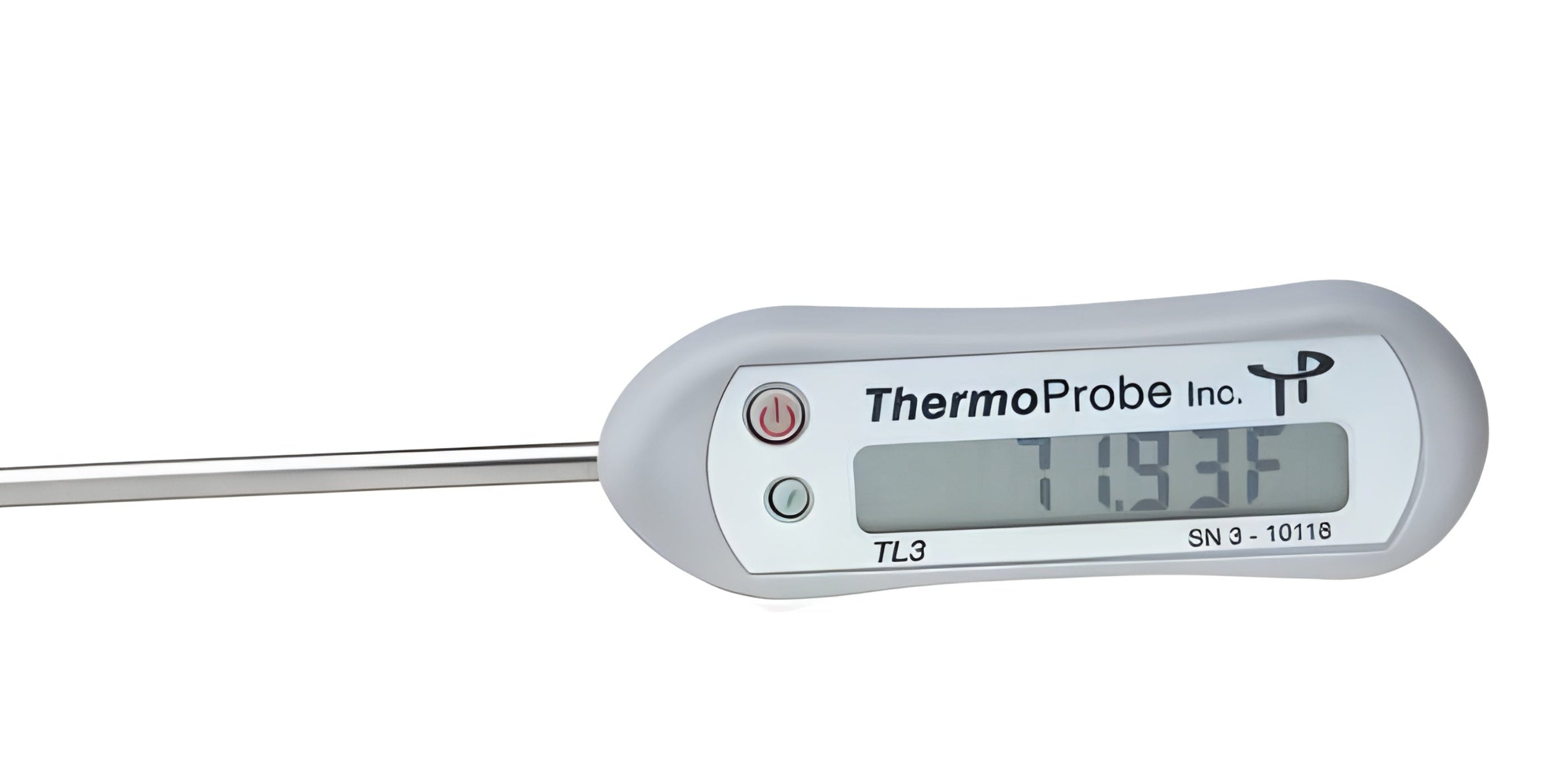 The TL3 is constructed with a molded glass-filled nylon case and stainless steel temperature probe. Different from many electronic thermometers, the “Cordless” TL3 has no wires to get in the way or break. The silicone button interface makes for intuitive operation. Standard probe lengths are 8 and 12 inches with additional lengths available upon request. The ThermoProbe TL3 comes equipped with an easily replaceable coin cell battery, providing up to 100 hours of operation.