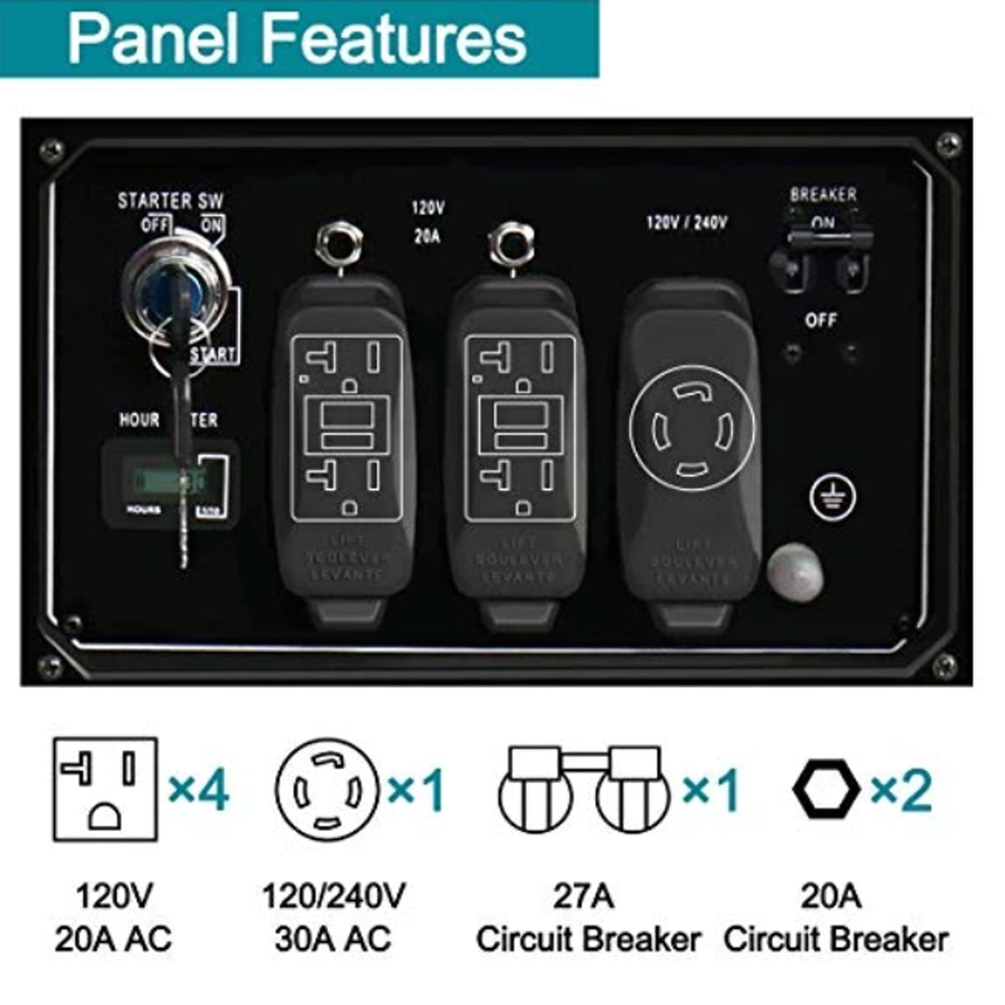 This generator has (1) 120 AC, 20A duplex receptacle, another 120 AC, 30A locking receptacle, (1) 27A circuit breaker, and (1) 20A circuit breaker. This generator has a 5.8 US-gallon gasoline tank that can run up to 8.6 hours. This generator has a low oil shutdown system and voltage stabilizing system for further protection, equipped with a control panel and fuel tank.