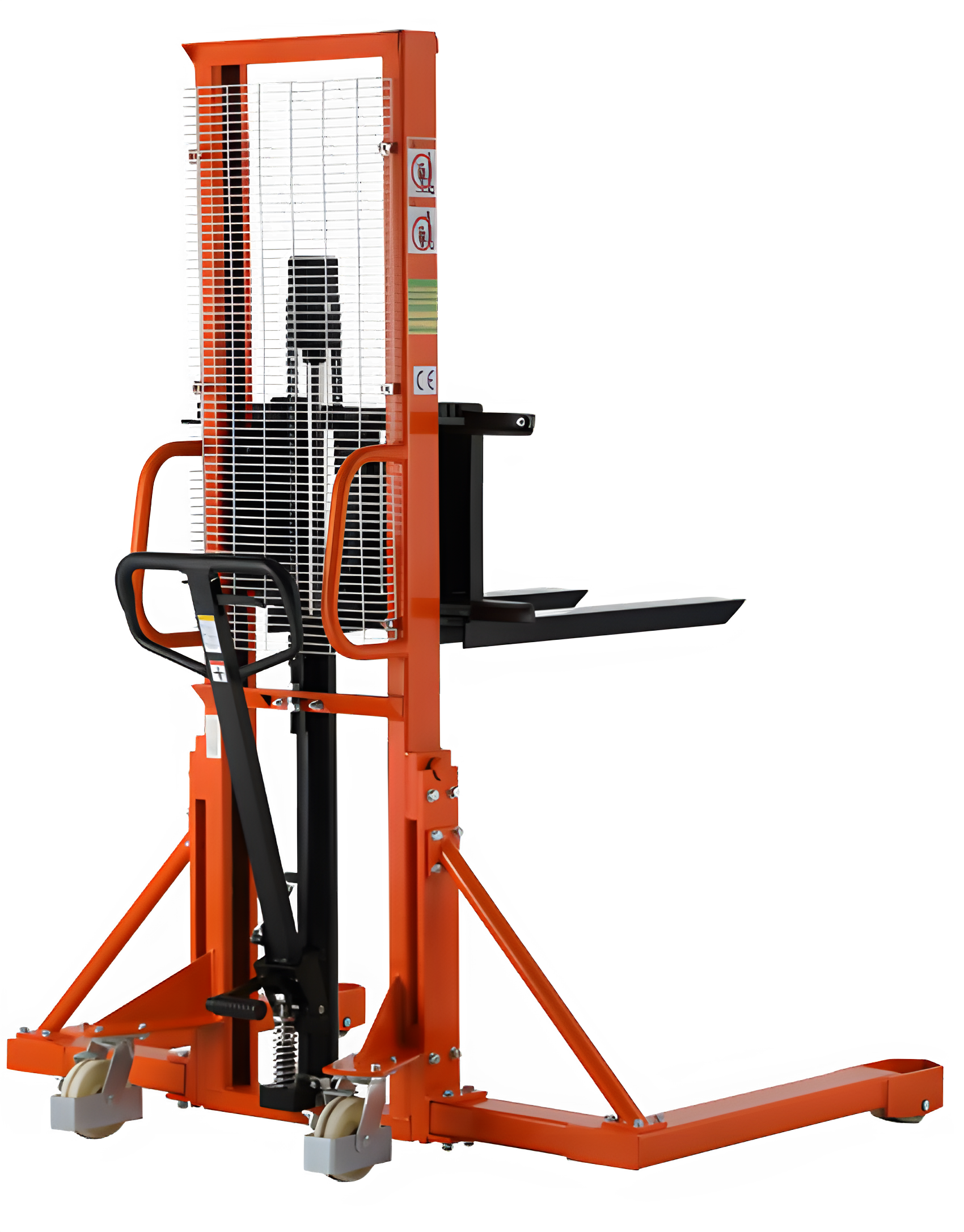 The Tory Carrier Manual Stacker is designed with straddle legs and adjustable forged forks. Foot and hand controlled lifting function allows the operator to work without having to perform extreme body movements. The manual stacker is rated for 2,200lbs and the lifting height is 63".
