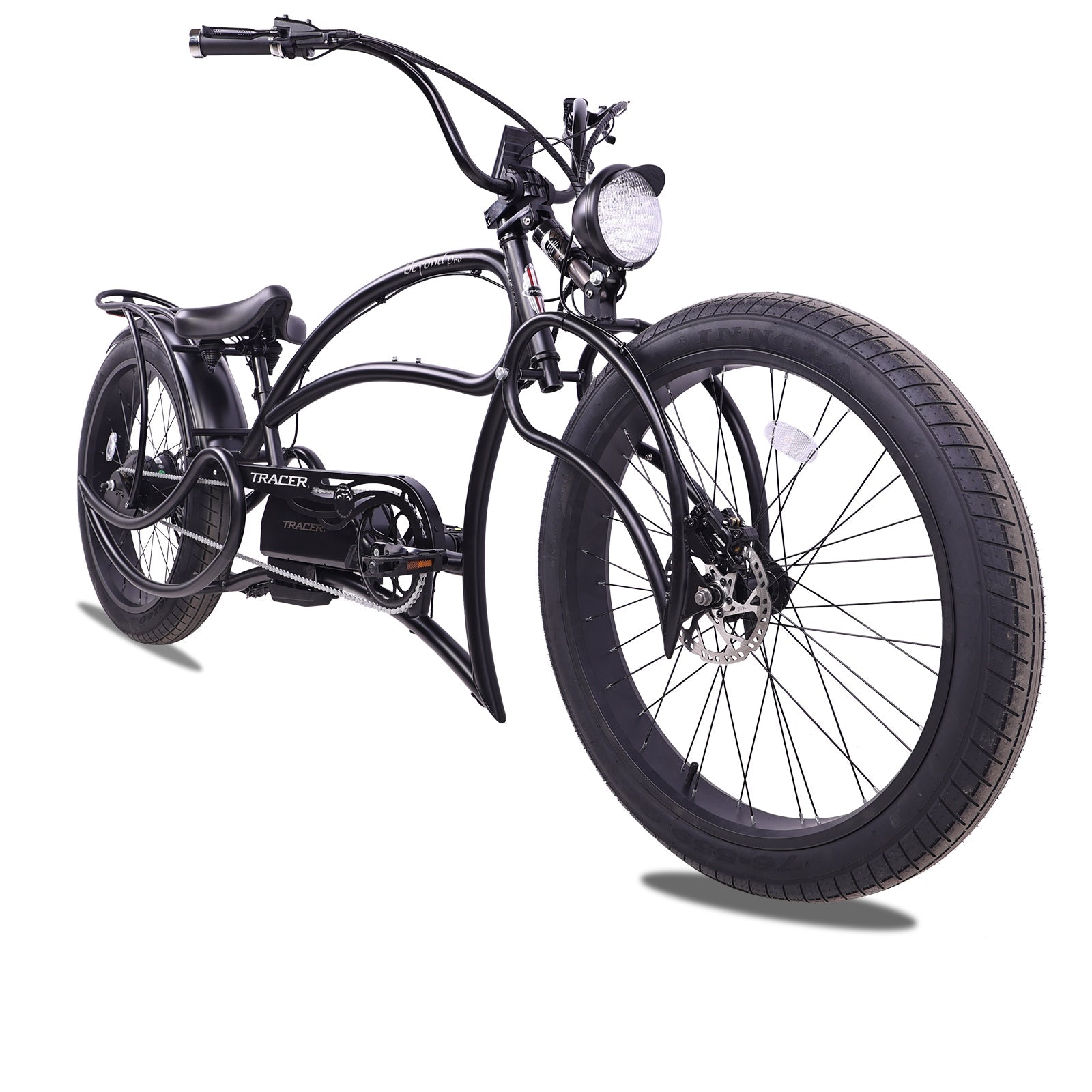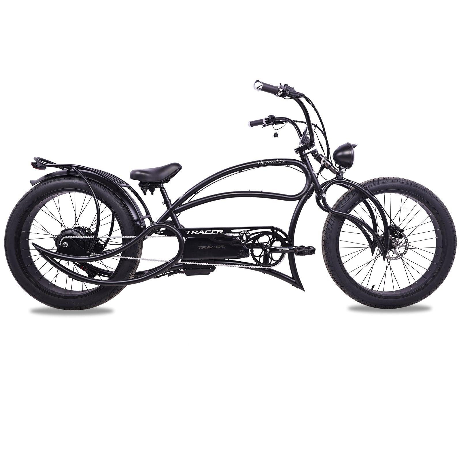 Introducing the Tracer Classic Stretch Chopper Hi-Ten Steel Electric Bike, the perfect combination of style, power, and comfort. With a sleek and stylish design