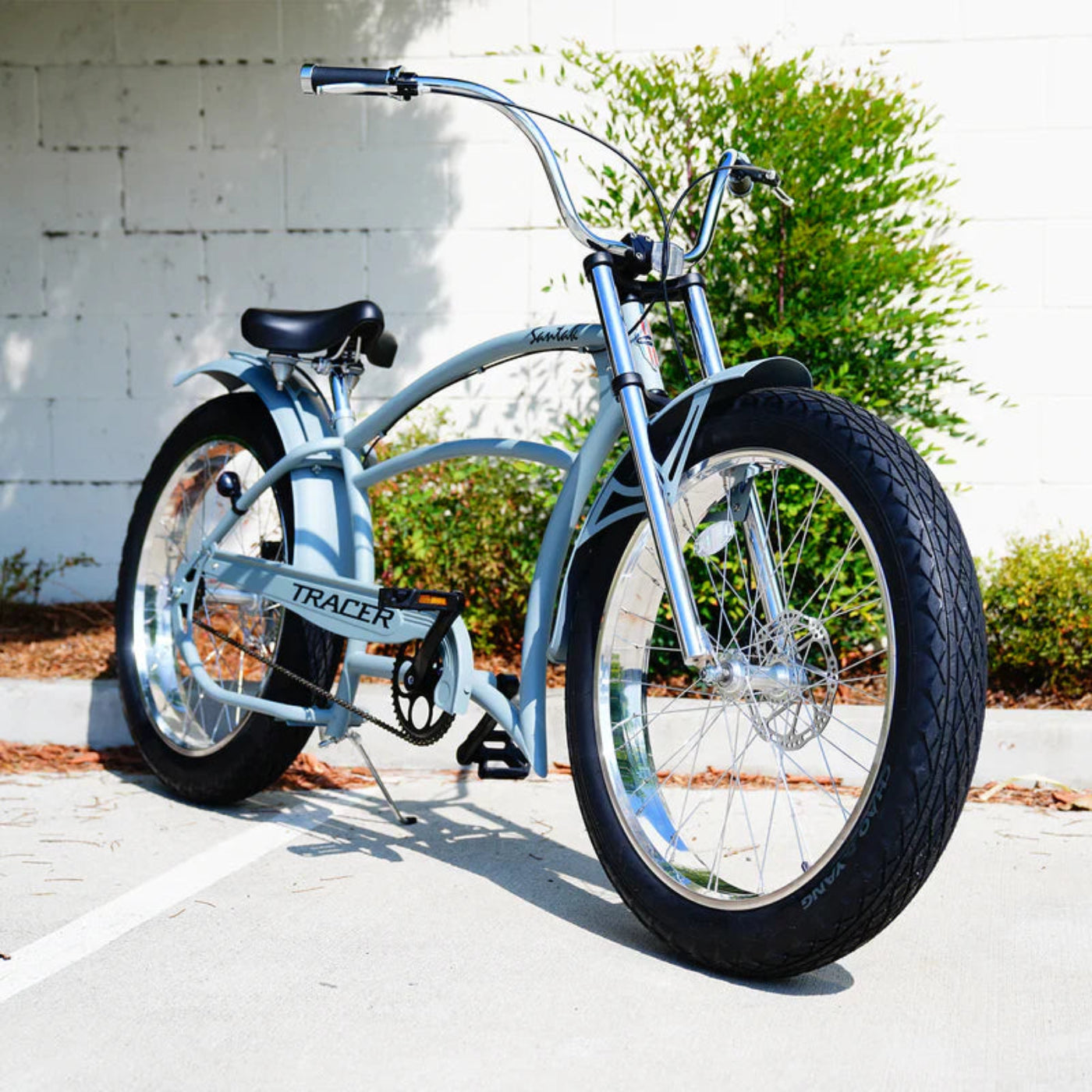 A: The bike is equipped with 26" x 4.0" fat tires, ensuring superior stability and traction on various terrains, such as city streets and sandy beaches.