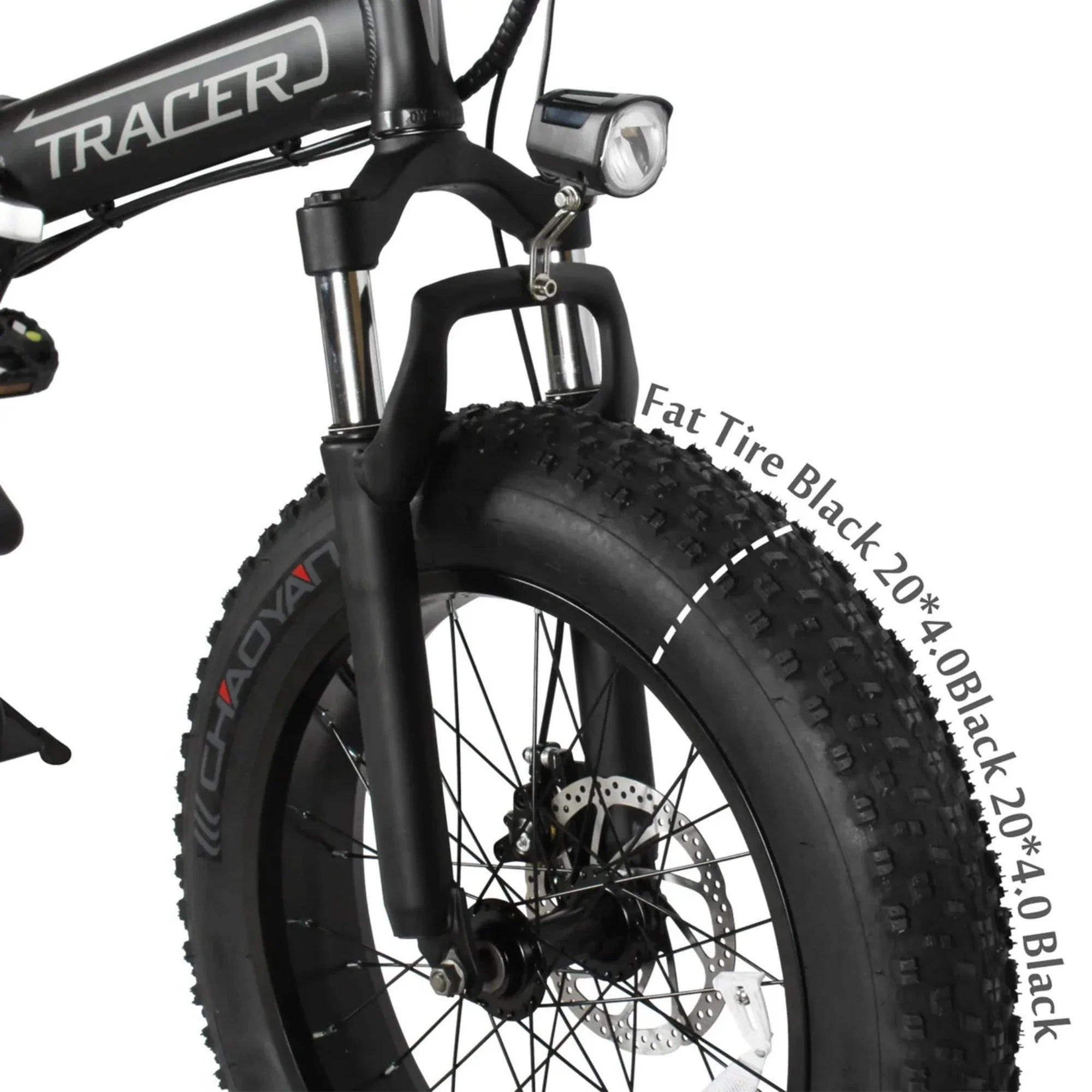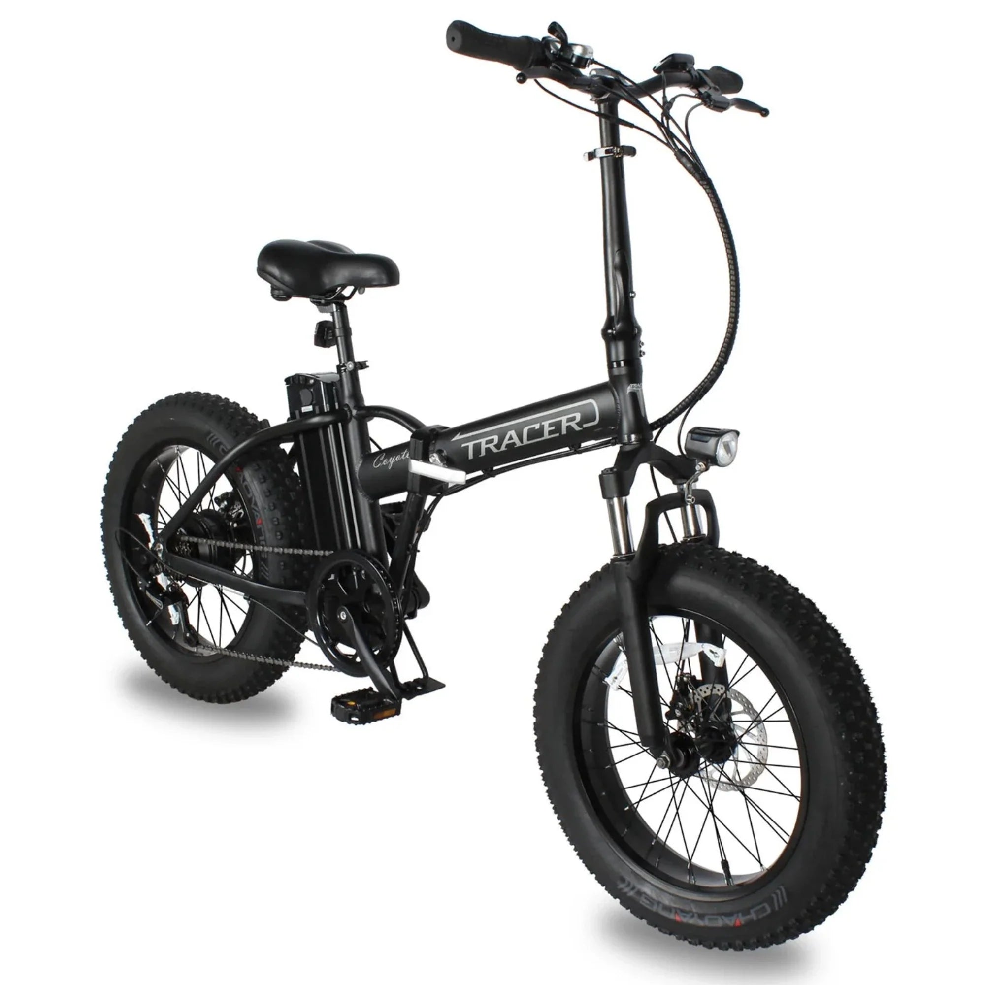 The Tracer Coyote is a compact 500W foldable electric bike with 20" fat tires, designed for portability, urban commuting, and versatile riding. It blends convenience with performance in a space-saving frame.