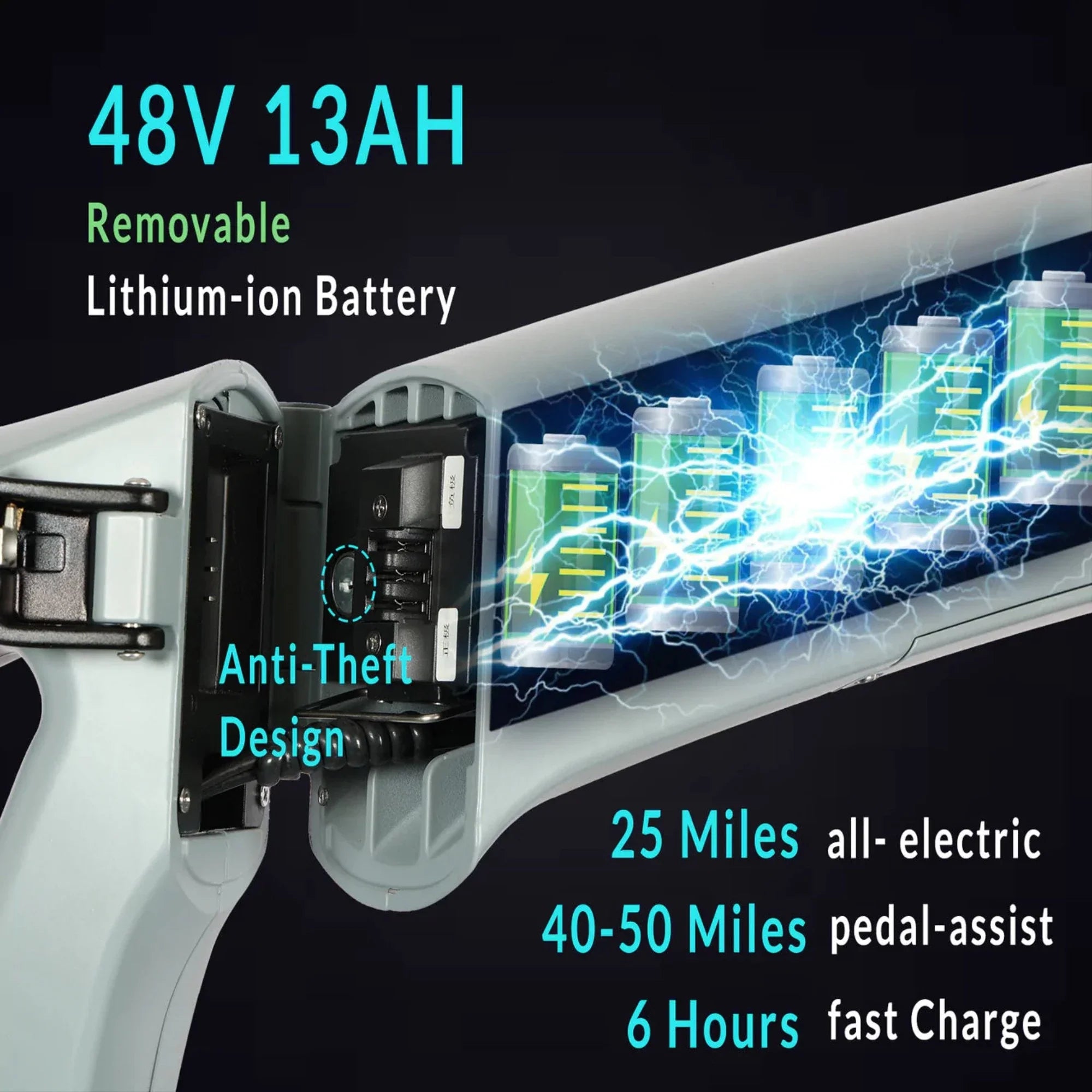 Battery Specifications | 48V13Ah, Motor 750W, Max Speed 45KM/H, Charging Time: 6 Hours |