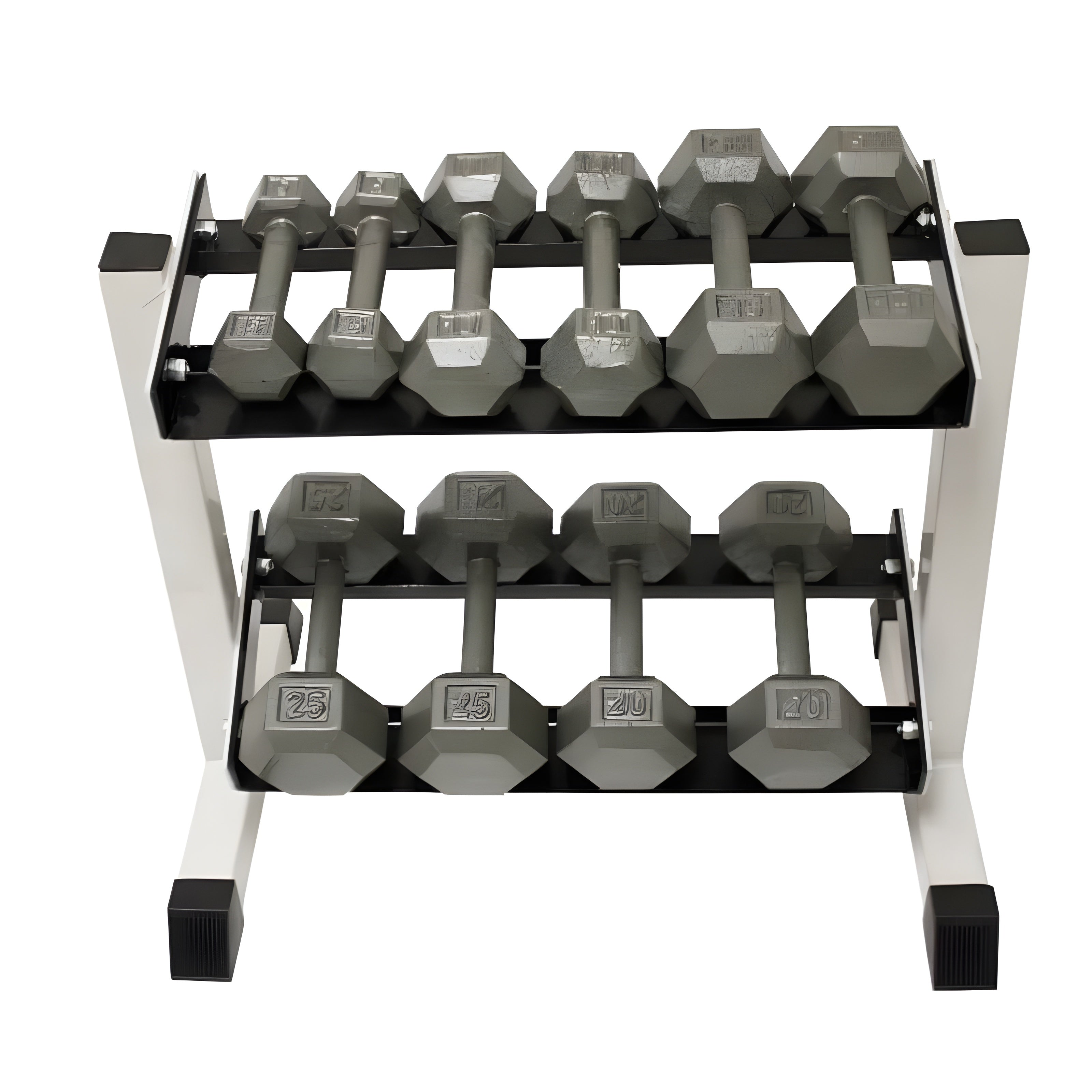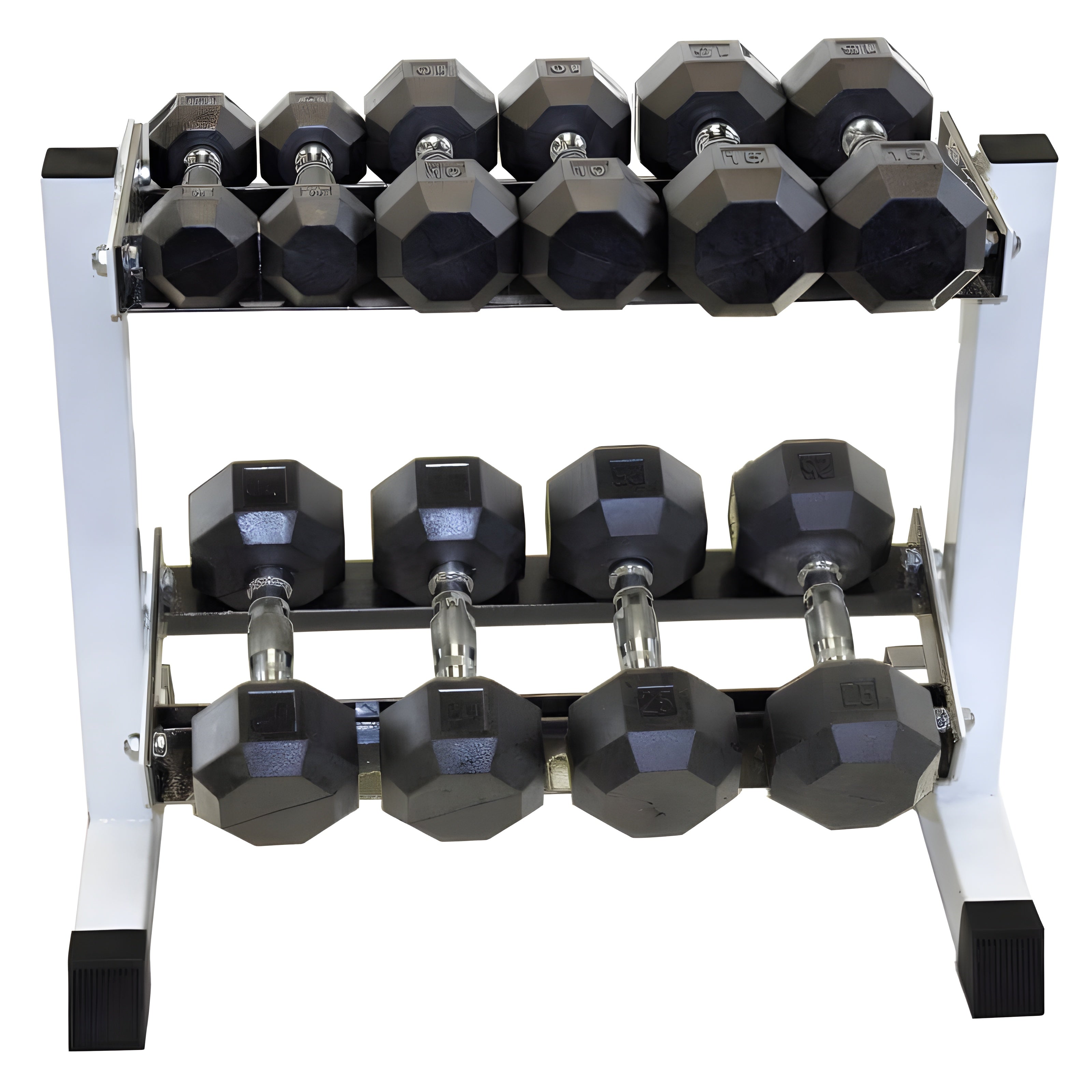A: It accommodates most standard and rubber hex dumbbells.