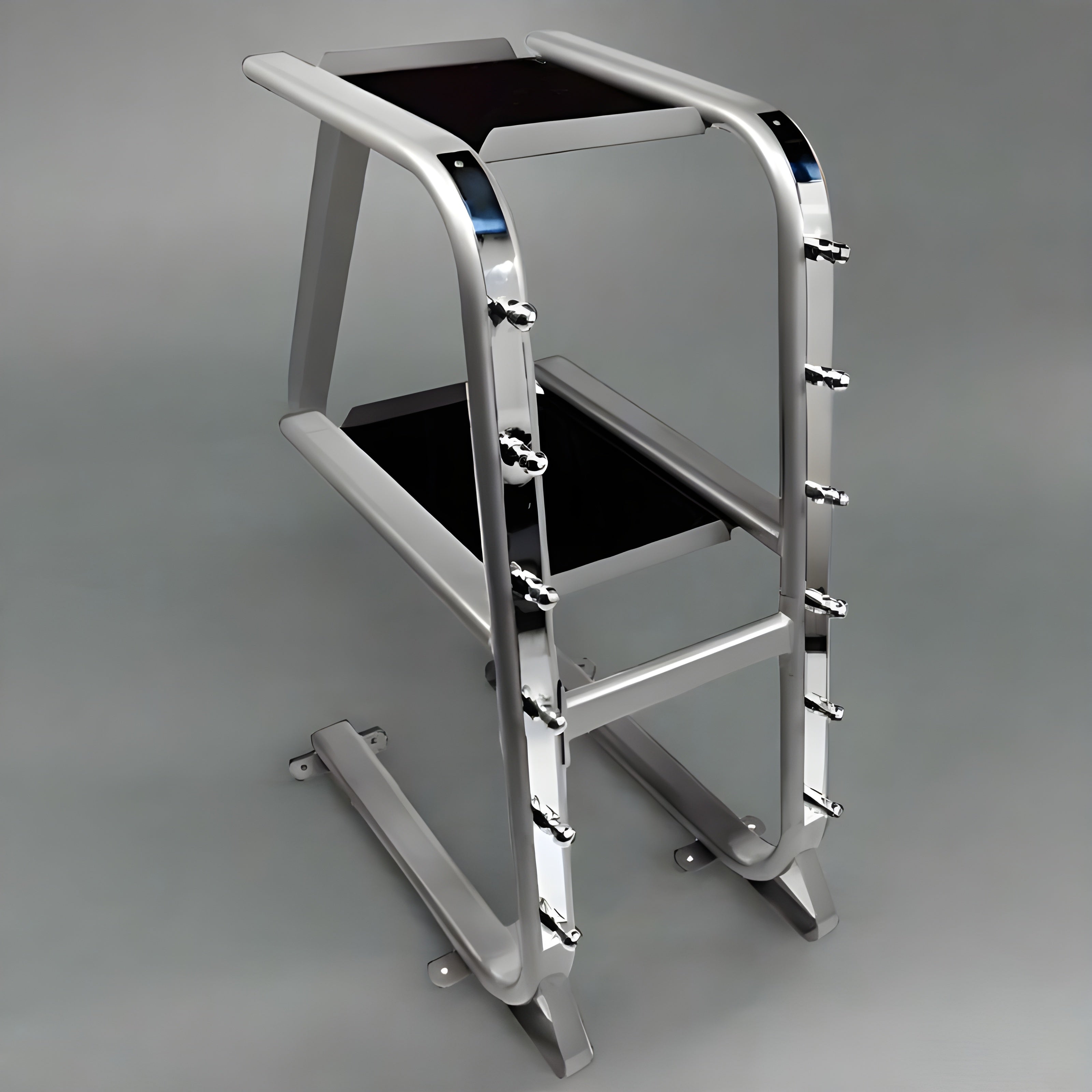 - Built with chrome wear guards to protect the paint finish, this gym accessories rack offers long-lasting durability and a sleek appearance.