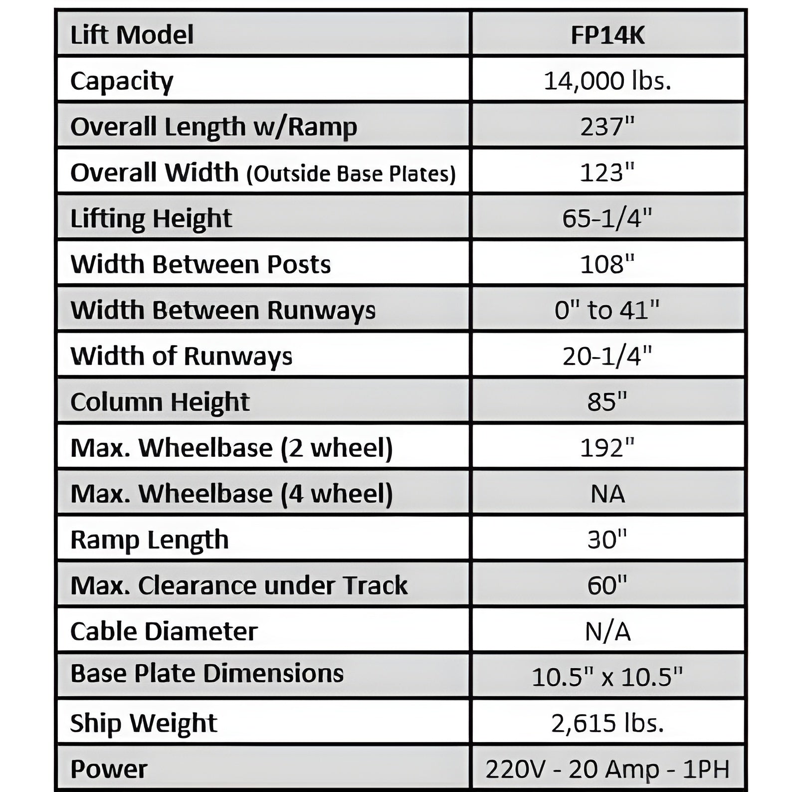 A: The Tuxedo FP12K-K is a 12,000 lb cable-driven four-post lift designed for automotive repair shops, garages, and enthusiasts. It’s built to raise vehicles for maintenance, storage, and repairs.