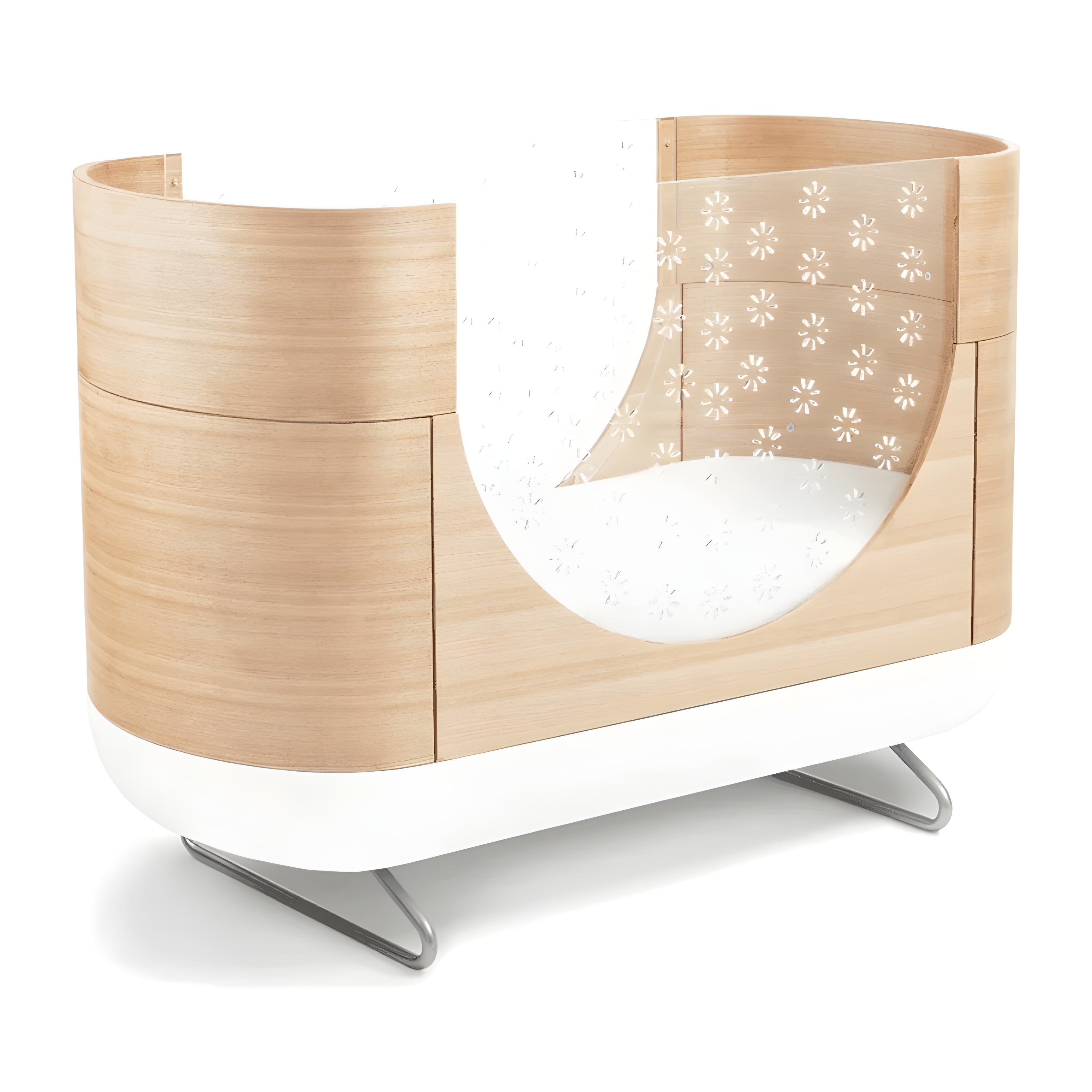The Ubabub Pod Crib is a cozy cocoon-shaped crib with smooth, rounded edges for a distinct modern look. Innovative clear acrylic sides allow for an unimpeded view inside the crib, making checking on baby simple. A series of carefully designed star shapes have been laser-cut out of the sides to provide additional airflow, while still being small enough to keep little fingers safe. The Pod Crib is easy to assemble, clean and maintain, and includes a custom-fitted mattress, junior bed conversion kit and features two adjustable mattress positions.