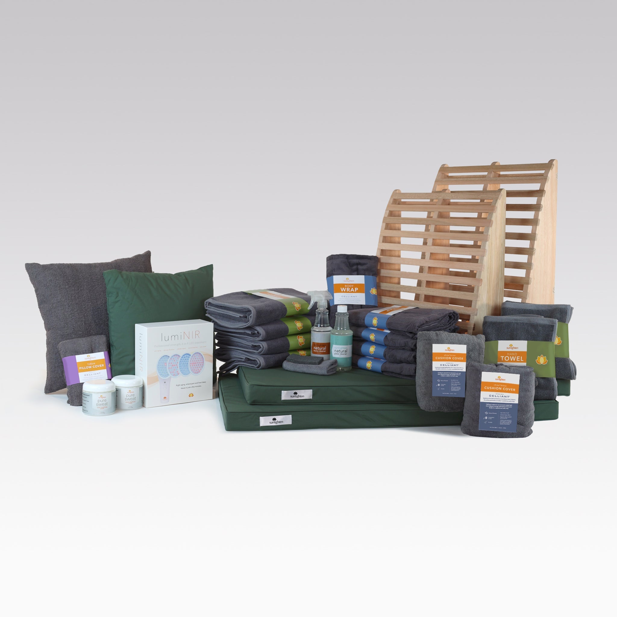 Everything you could possibly want to make your sauna the ultimate escape and wellness sanctuary. Includes an ample sauna linen supply, every available seated comfort option, sweat amplifying cream, and our handheld light therapy device with 4 different options for anti-aging, cell renewal, clear skin, muscle recovery, pain relief and wound healing. Enjoy a perfectly clean sauna every time with special cleaning supplies also included in the package. Create your own personal oasis with the Ultimate Rejuvenation Package - 4 Person Saunas!