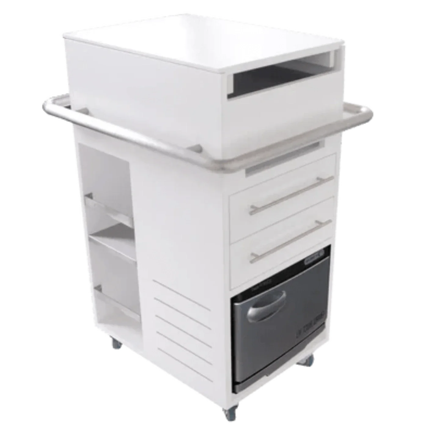 This multi-functional, beautifully-crafted cart serves up spa services with a touch of grace. We designed the cart to be a technician’s dream. A stainless-steel wax compartment hides beneath a sliding shelf, complete with a removable steel cover-tray, making cleanup a breeze. The integrated tip-out rubbish bin is complemented by a removable plastic-bag holder, perfectly positioned for disposal of wax strips. For hot towels on the move, a built-in cabinet compartment rides along. Need dry towels? Those are also along for the ride, as well as the storage shelves. A universal mag-lamp mount comes standard. Please inquire about optional steamer mount. Drawers above the hot towel cabi compartment were designed to hold your tools-of-the-trade. Upon arrival, use the locking casters to park your cart and you’re ready to start. This is one smooth cart!