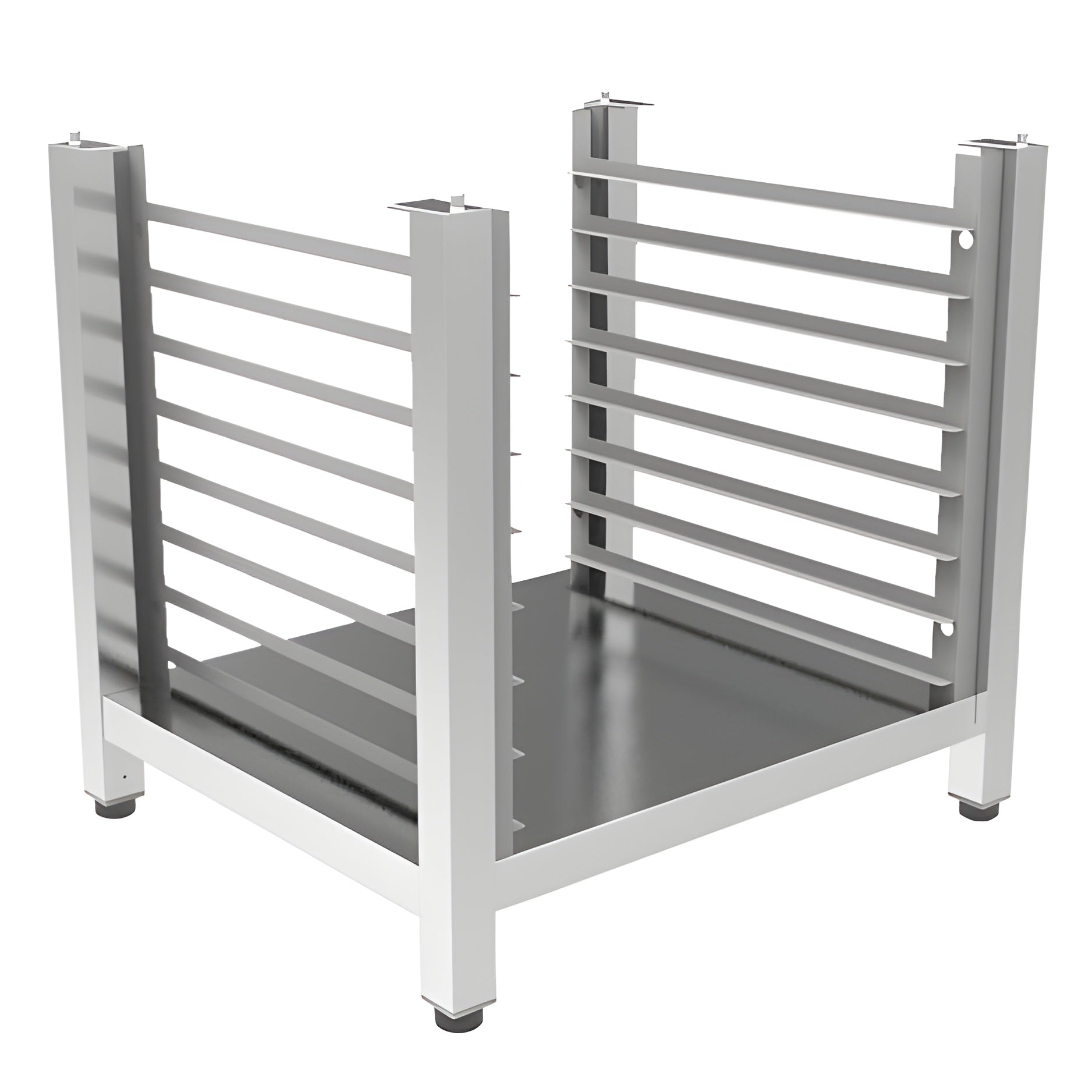 High open stand compatible with full-size Bakerlux convection ovens by Unox accommodates full-size (18" x 26") sheet pans. The space between trays is 2.5 inches.