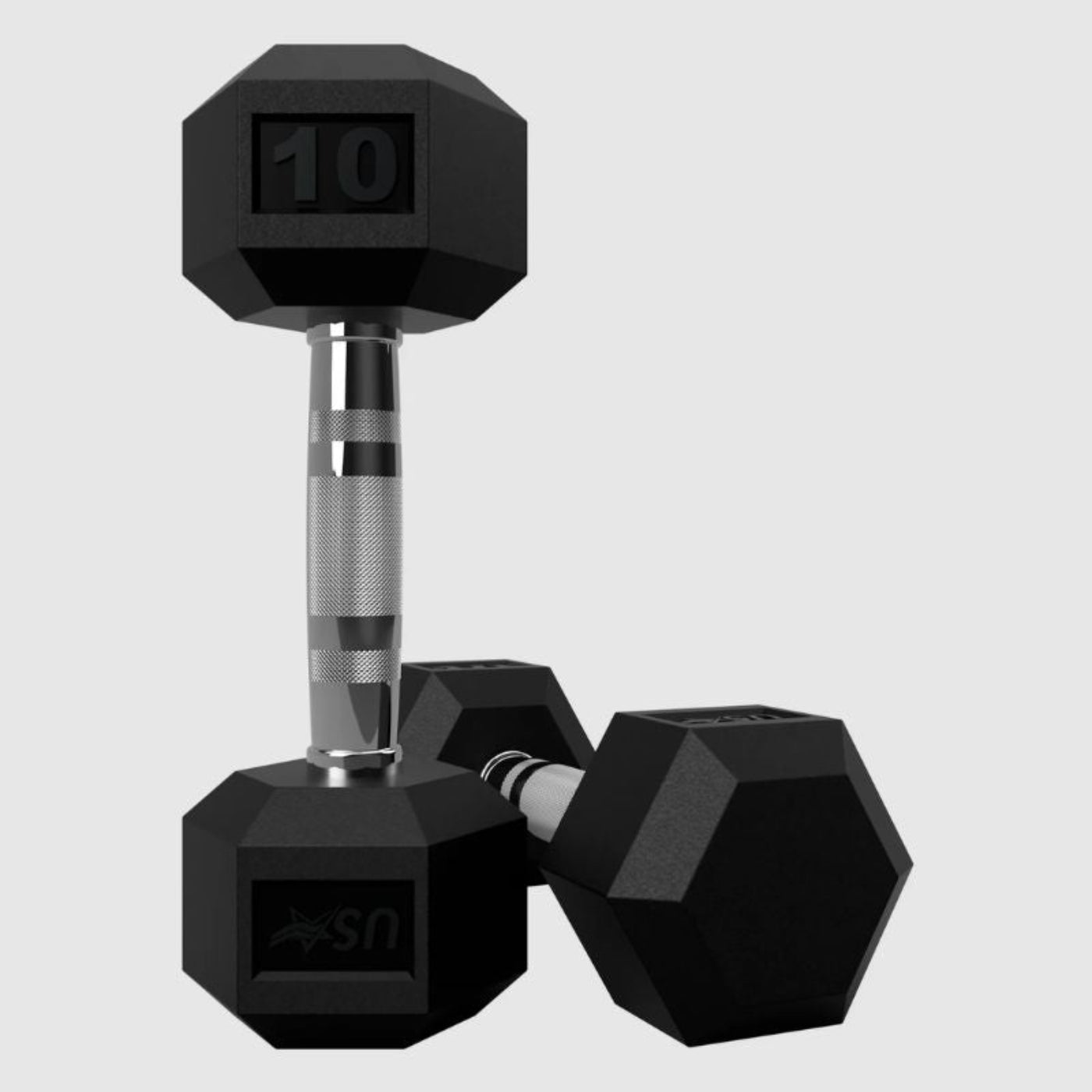 The USA by Troy HD-R Rubber Hex Dumbbells are designed to meet the needs of both home gyms and commercial environments. Each Troy dumbbell features a solid, anti-roll head securely friction-welded to a steel, chrome-contoured handle for long-lasting performance. The rubber coating reduces noise while protecting floors and equipment, making these Troy dumbbells a great choice for any workout space.