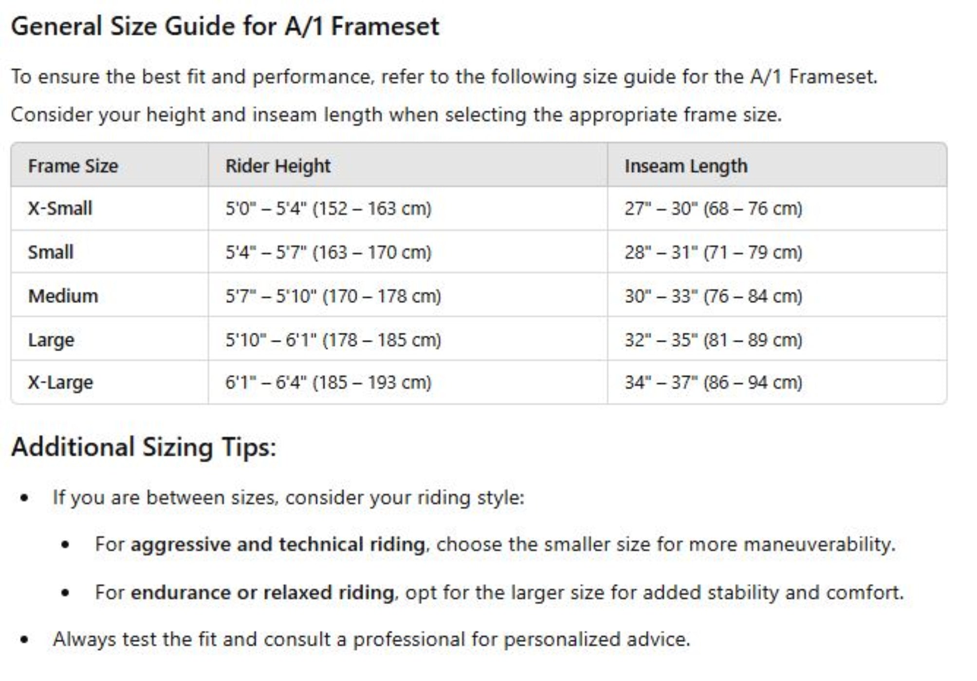 The bike is available in sizes ranging from XS to XXL, accommodating a wide range of rider heights and preferences.