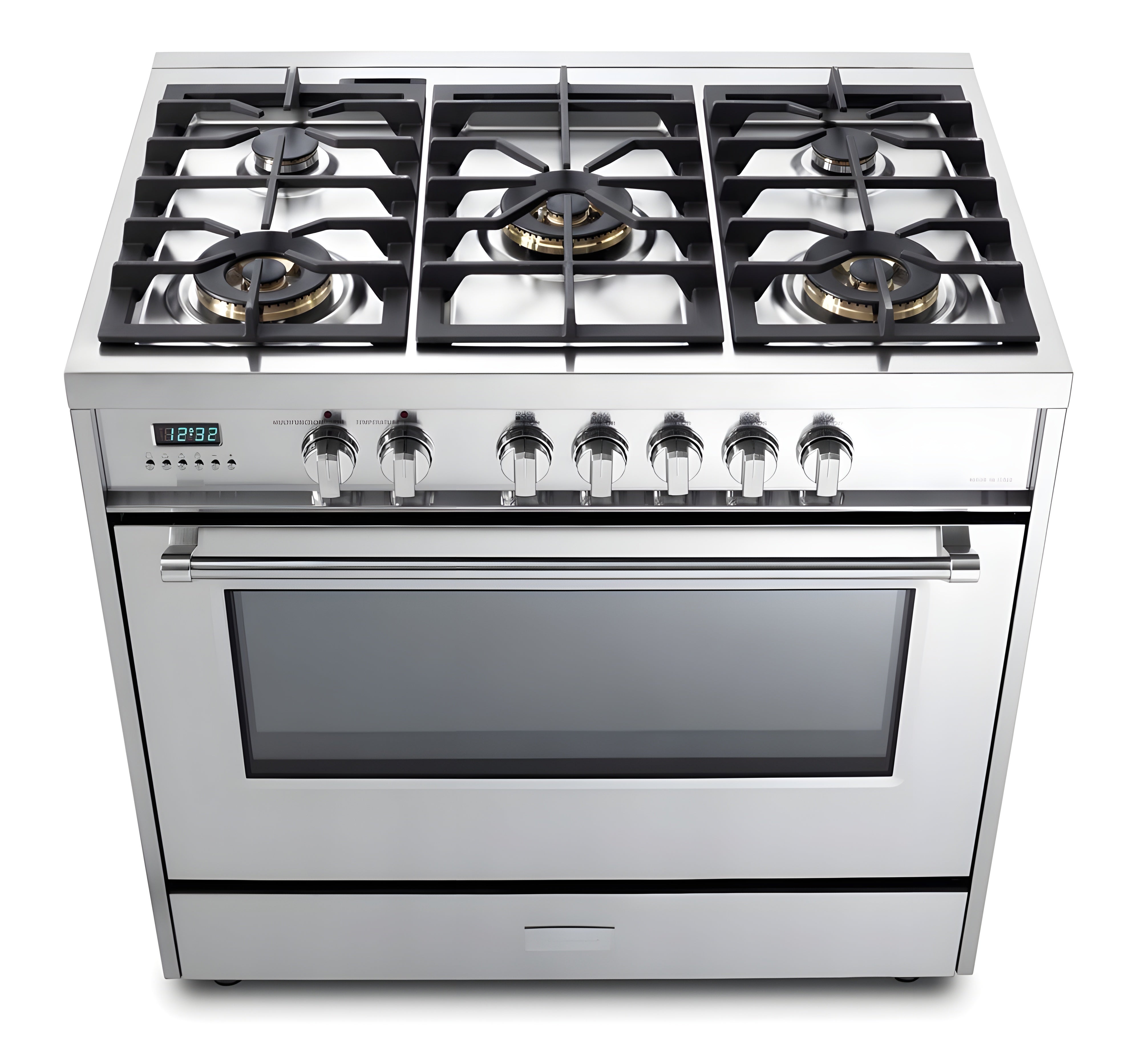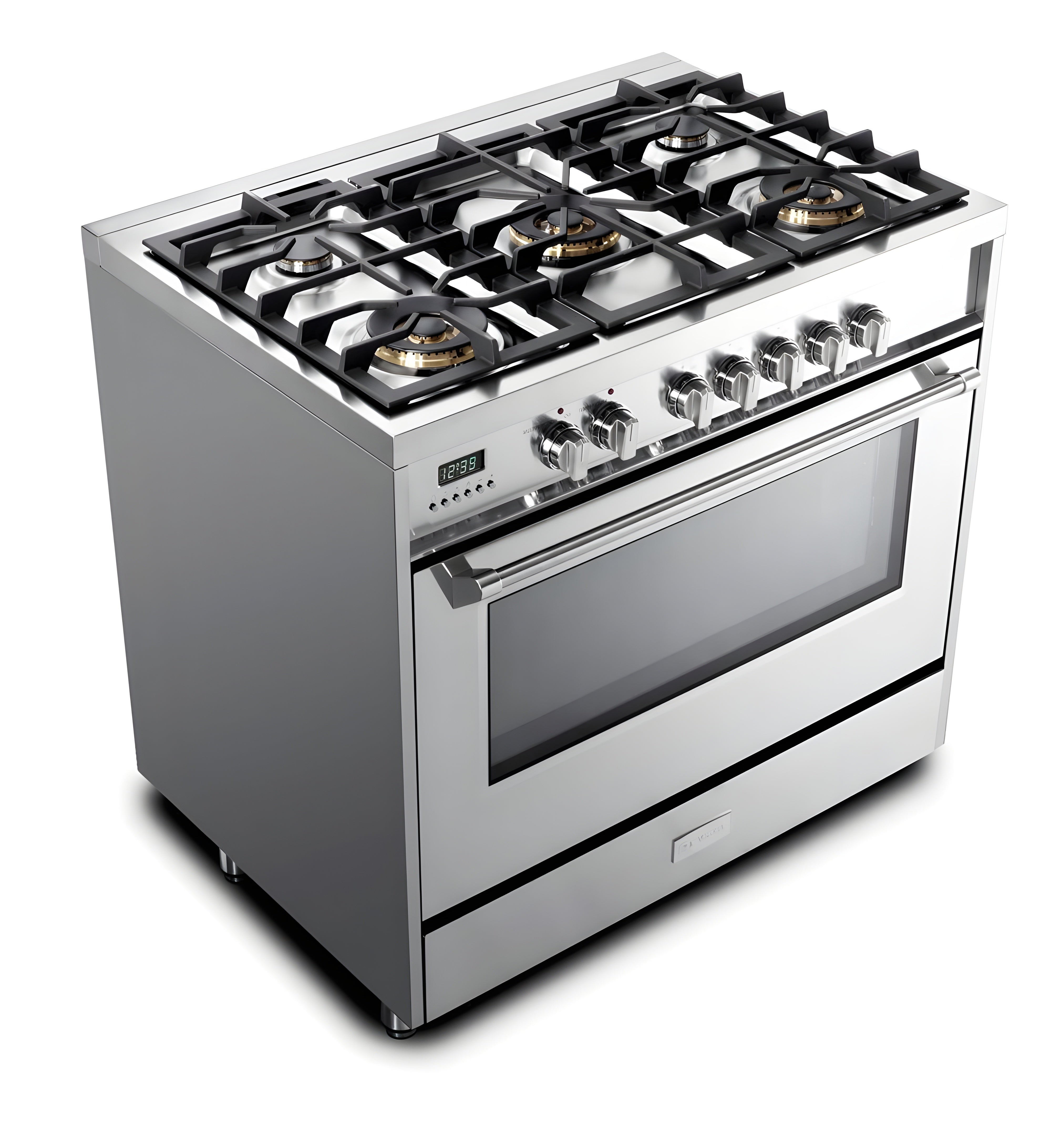 A: The range includes 5 sealed gas burners, including a high-power burner for rapid boiling and a simmer burner for delicate cooking.