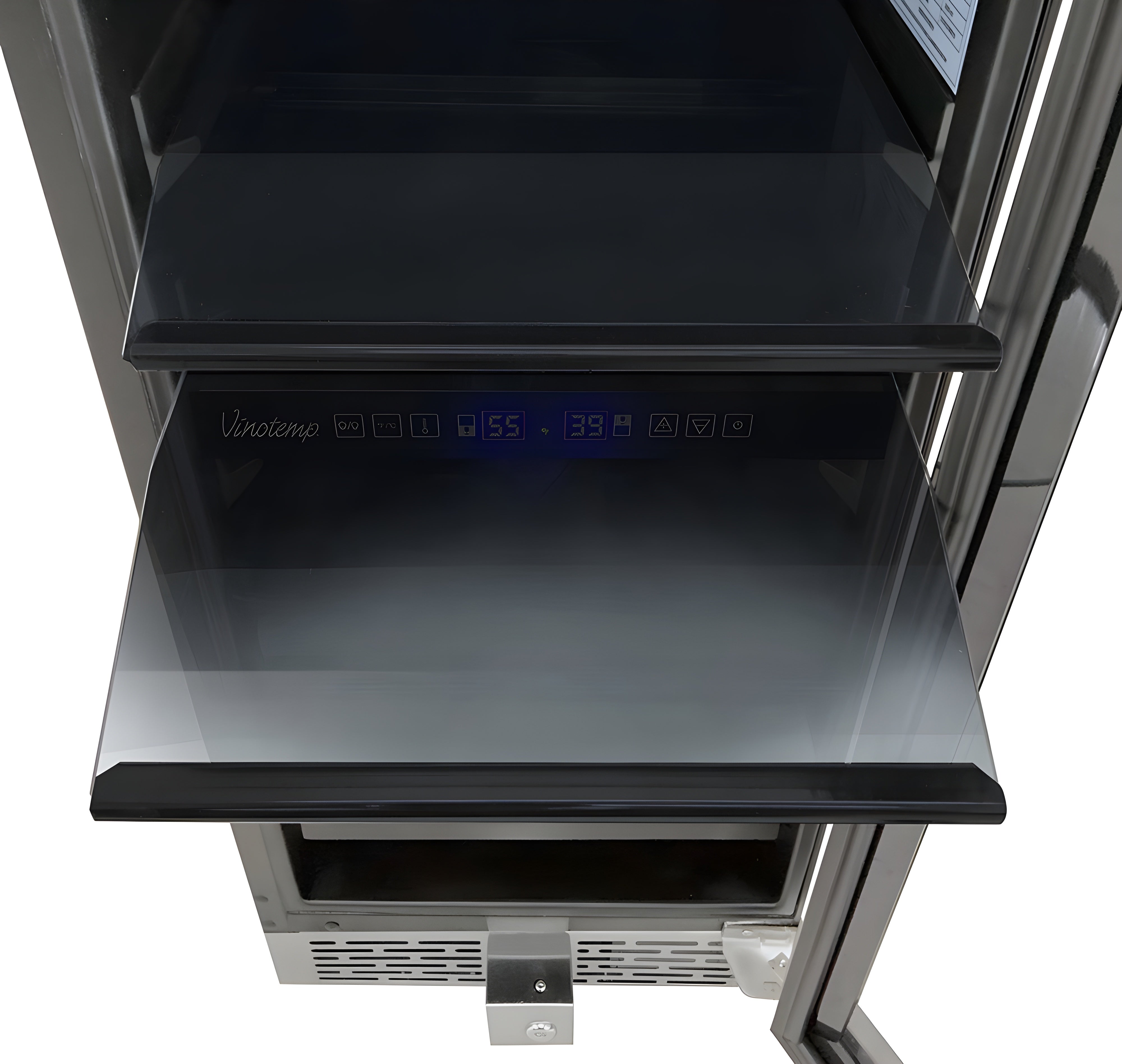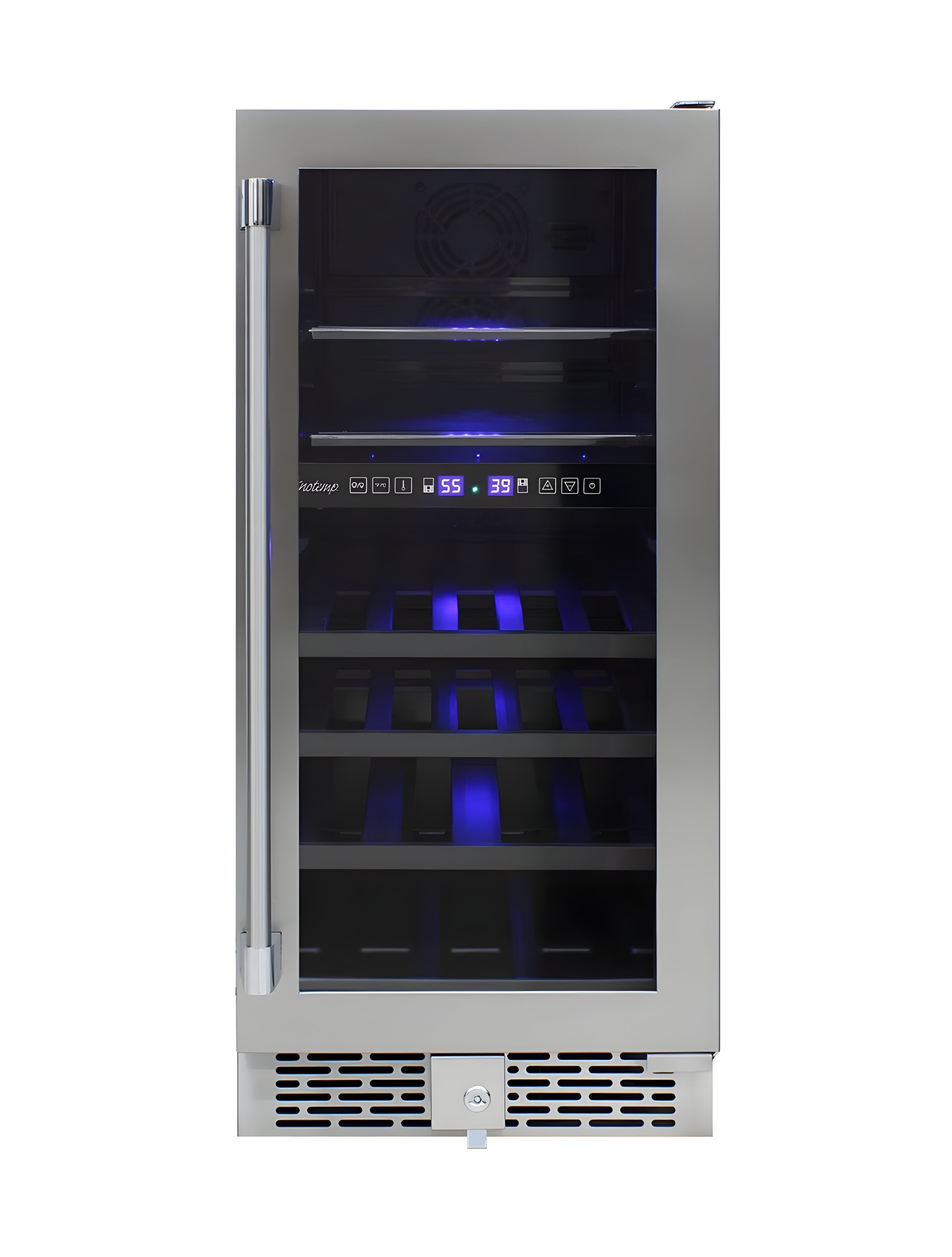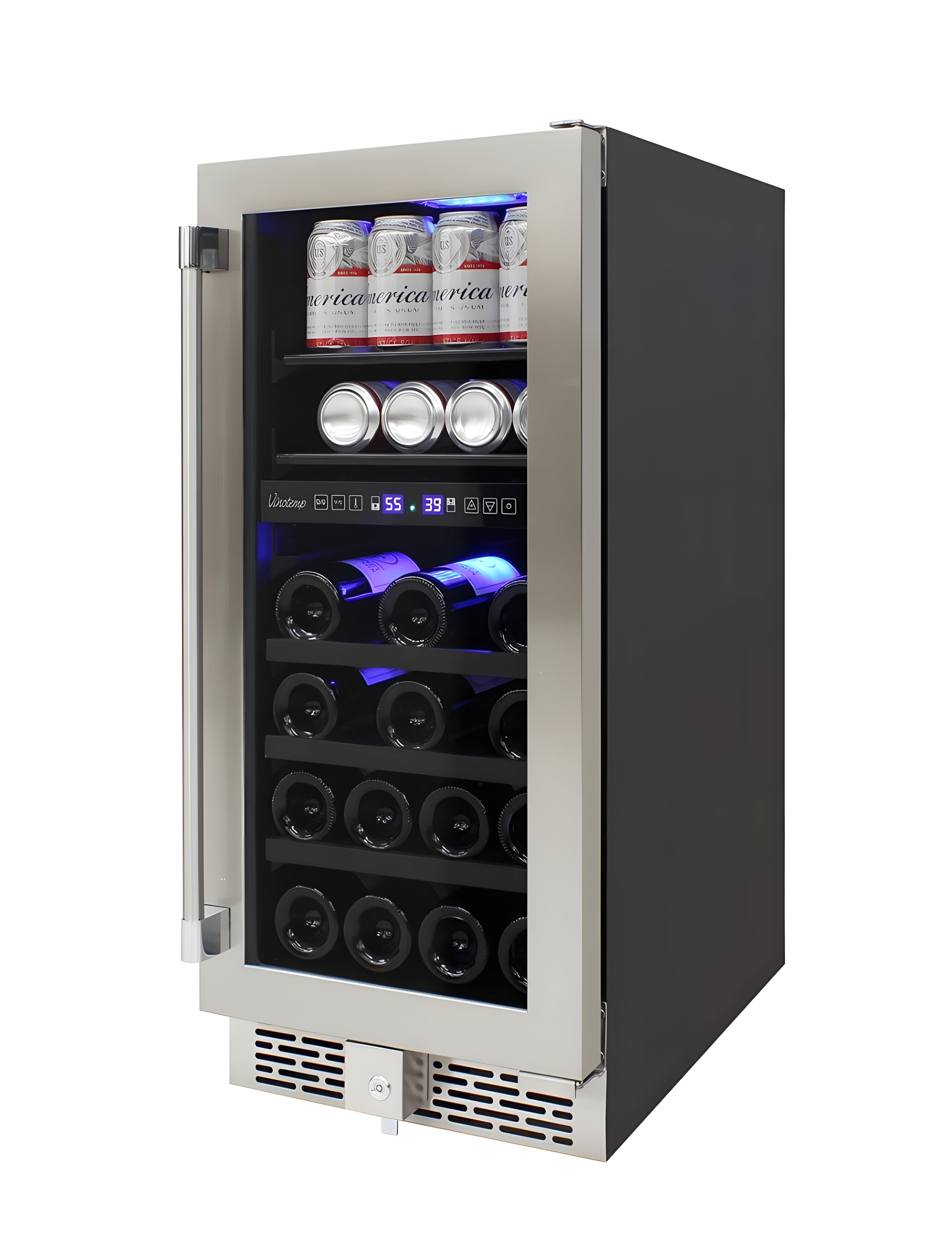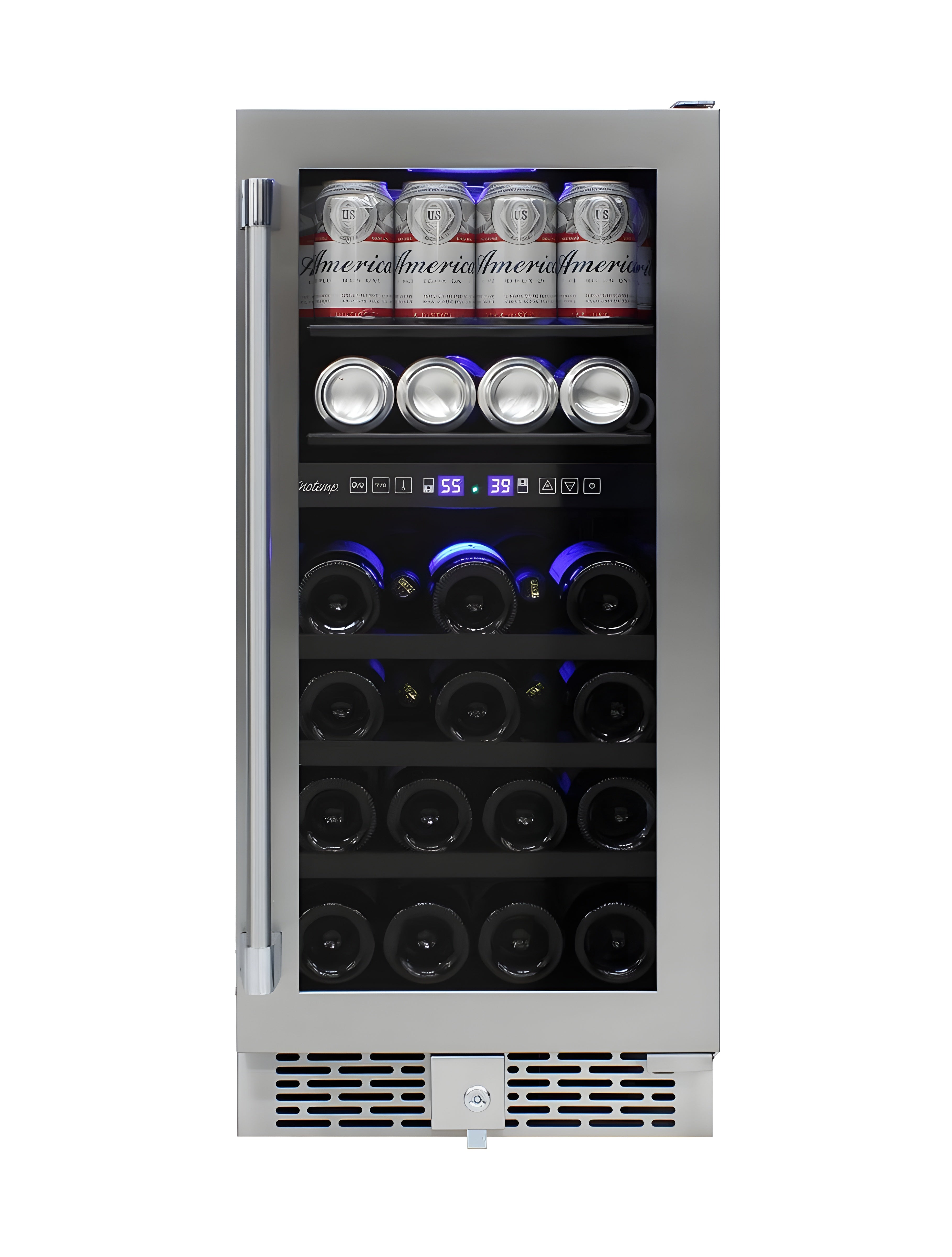 Vinotemp's 15-Inch Outdoor Dual-Zone Wine & Beverage Cooler is an extremely versatile unit and was designed to fit seamlessly into your cabinetry by providing a premium storage space for your beverages and wines without interrupting the style that your home environment demands. Modern styling features a dual-pane glass door with a stainless steel frame. This cooler allows you to set two separate temperatures to provide the optimum conditions for your wine and beverages. While this cooler is designed for the outdoors, it makes a perfect addition to any indoor space as well!