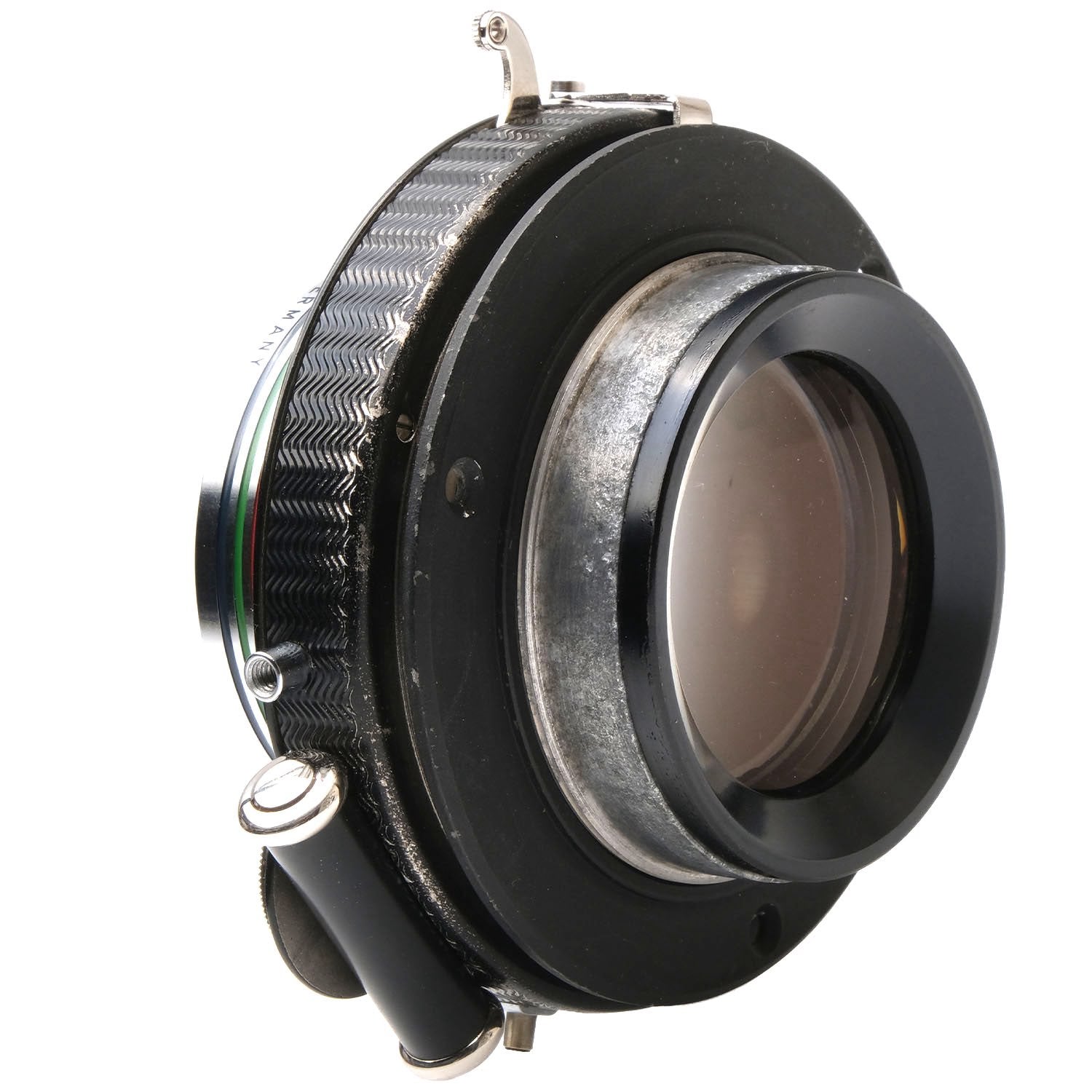 This Voigtlander 21cm f4.5 APO-Lanthar Lens, #6745070, is in great condition with minor handling wear. I rate it cosmetically a (9+). The glass is clean and clear with no haze, marks, or fungus. There are a few faint specks of dust inside, but they do not affect image quality. This lens has coverage up to 5x7" and a 55 degree angle of view. The included Compound shutter is in similar condition, also rated a (9+). The shutter speed wheel and aperture lever are smooth, and the shutter is accurate at all speeds above 5, but occasionally a bit fast at 1 and 2. The aperture functions properly. This lens includes a retaining ring and front & rear caps.