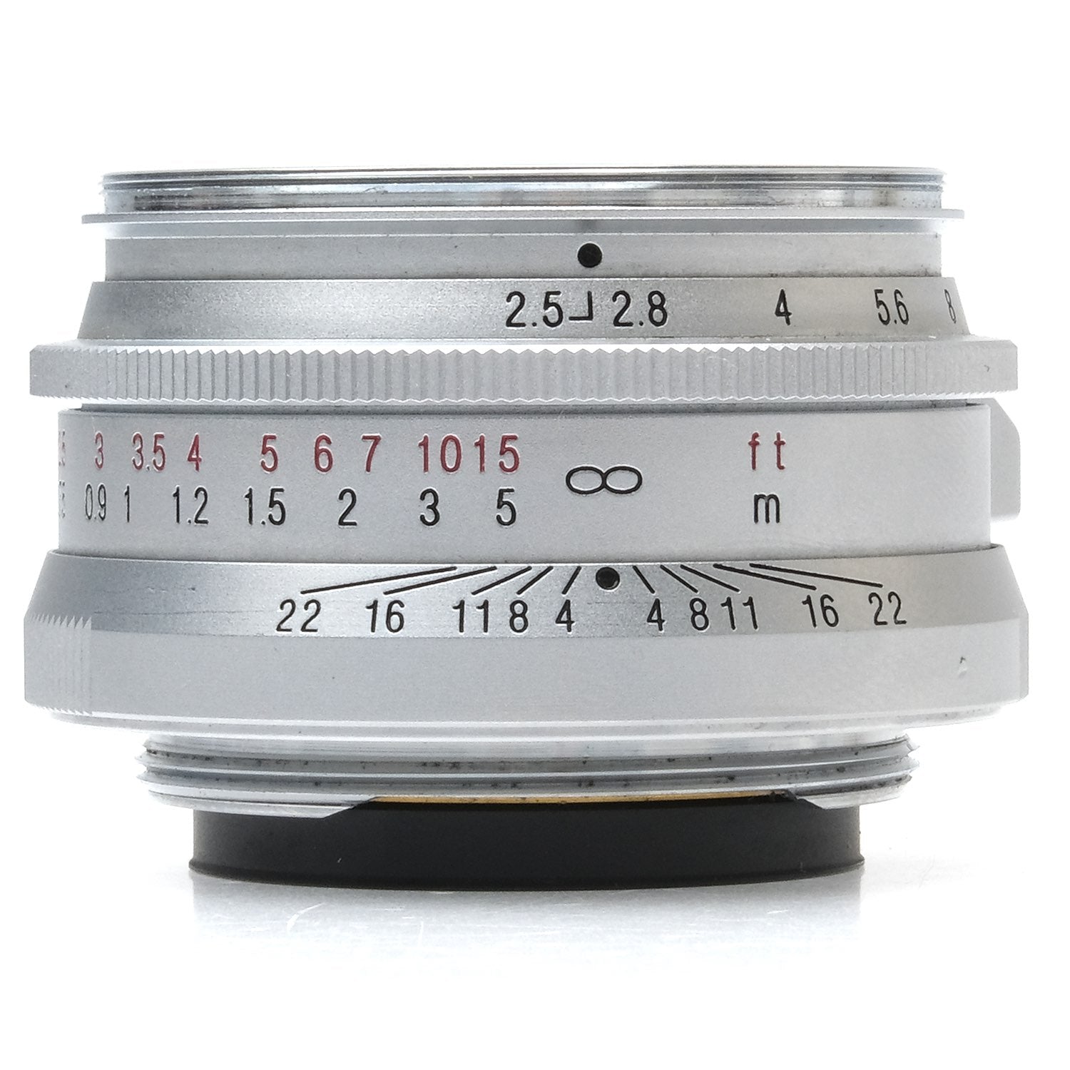 This Voigtlander 50mm f2.5 Color-Skopar Lens (Silver), #9220576, is in great condition with minor handling wear. I rate it cosmetically a (9). The focus ring is smooth, but the aperture ring is a bit stiff. The aperture functions properly, and the glass is clean and clear with no haze, marks, or fungus. There are a few faint specks of dust inside, but they do not affect image quality. This lens includes front & rear caps. It is for Leica screw mount/thread mount (LTM) and other E39 bodies. Please refer to the photos for details.