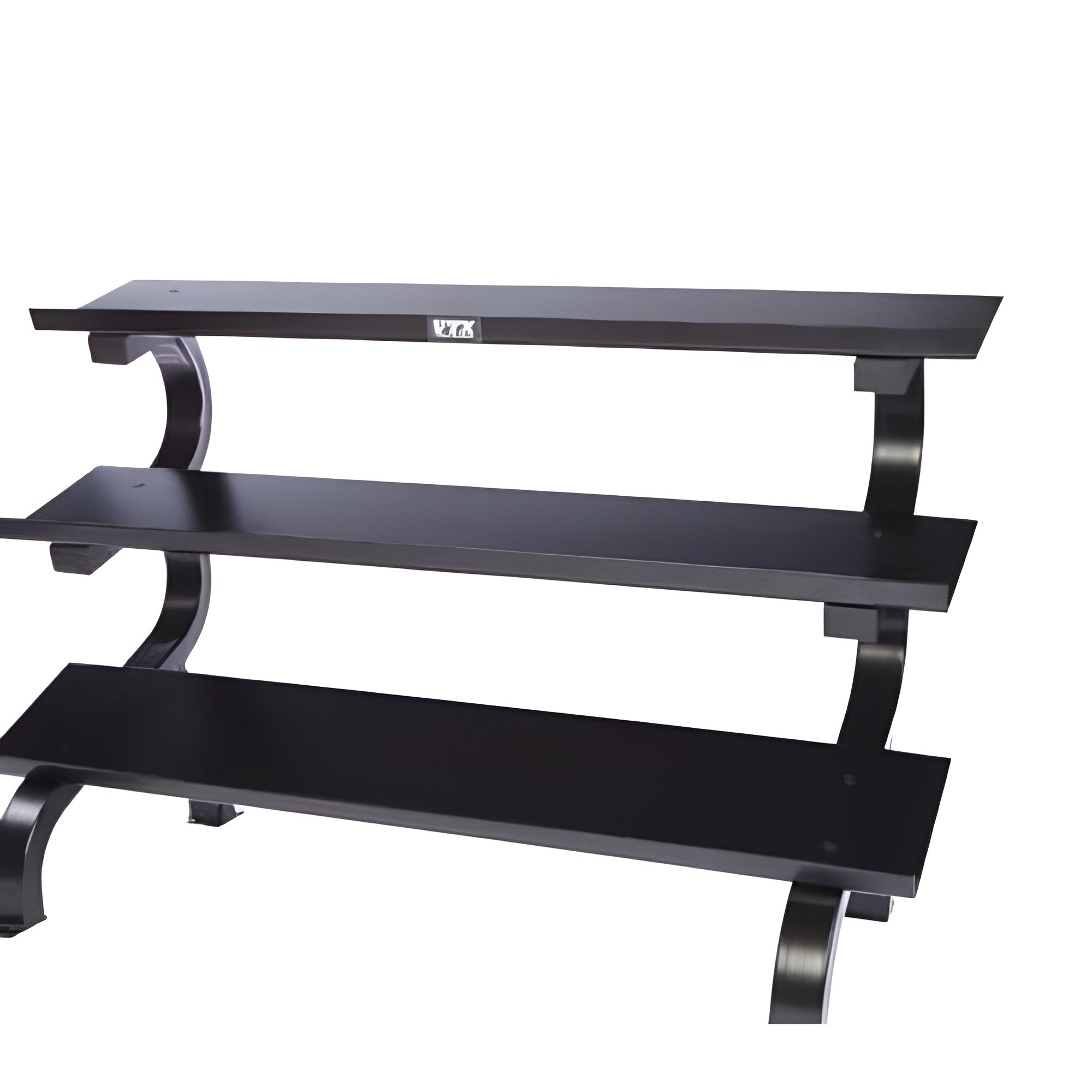 The VTX commercial-grade, 3 Tier Horizontal Shelf Rack holds a 5-75 run of solid dumbbells (15 pairs) with ease. The heavy duty, powder-coated shelves are anatomically angled for easy storage and removal. Eight flat head bolts drop through drilled holes in the shelving into a sturdy 2” x 3”, 11 gauge frame for quick, easy assembly. Does not include dumbbells.