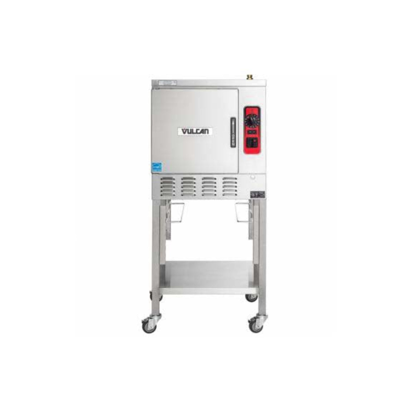 Single compartment electric ENERGY STAR® certified convection steamer. Low Water Energy (LWE) Smart Steam control reduces energy consumption and water usage. High output stainless steel generator with two-speed Staged Water Fill. Generator also includes Smart Drain System (timed drain) with PowerFlush. Operator controls include 60-minute timer with constant steam setting and an illuminated power switch in addition to cook and ready lights. Stainless steel exterior and cooking compartment with coved interior corners. Heavy duty door and door latch mechanism with door gasket guard. Shipped for 208/60-50/3 electrical service. Can be field converted to 240/60-50/3. Split water line connection. 11⁄2" NPT drain connection.