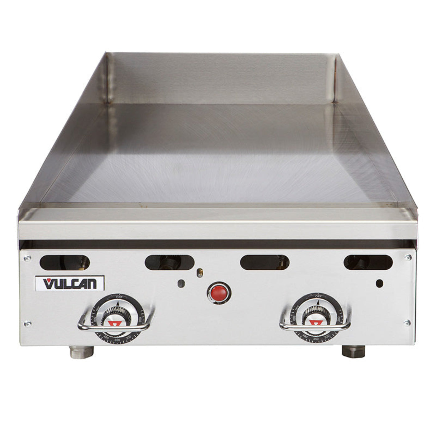 A: A 24” natural gas griddle with snap-action thermostatic controls for precise temperature management in commercial kitchens.