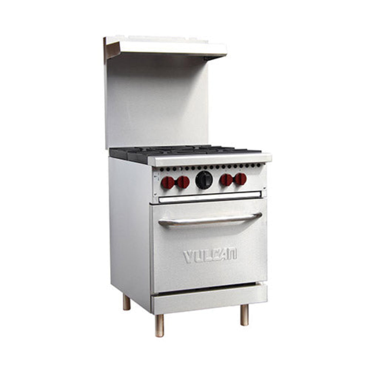 The Vulcan SX24-4B is a 24" commercial gas range, with a space saver oven, and four open top burners. The space saver oven can hold a full size bake sheet front to back.