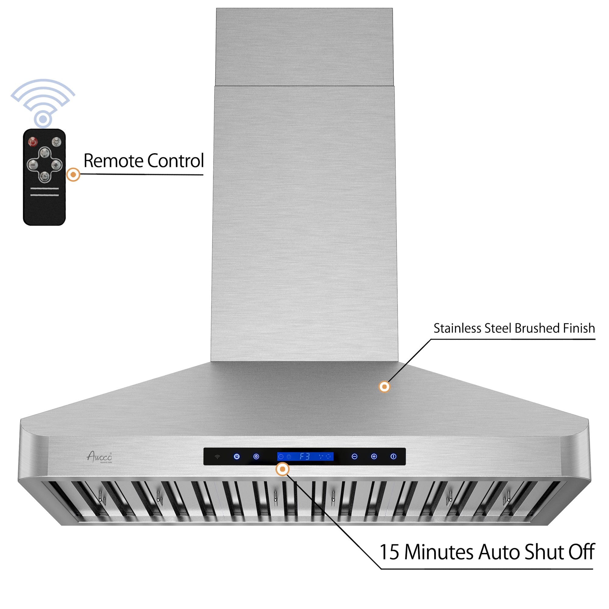 Awoco RH-WT Wall Mount Stainless Steel Range Hood, 4 Speeds, 6” Round Top Vent, 900CFM, 2 LED Lights, with Remote Control - RH-WT-30