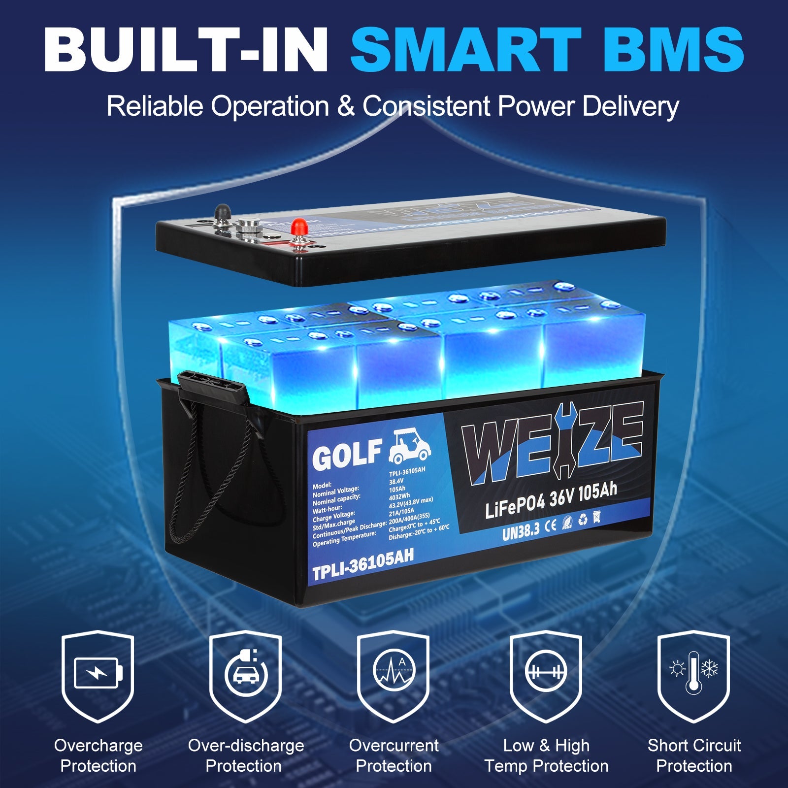 Built-In 200A BMS: The WEIZE 36V 105Ah lithium golf cart battery features a built-in 200A Battery Management System (BMS) that protects against over-charging, over-discharging, over-current, high/low temperatures, and short-circuiting. With excellent thermal and chemical stability, this maintenance-free battery eliminates daily upkeep and costs.