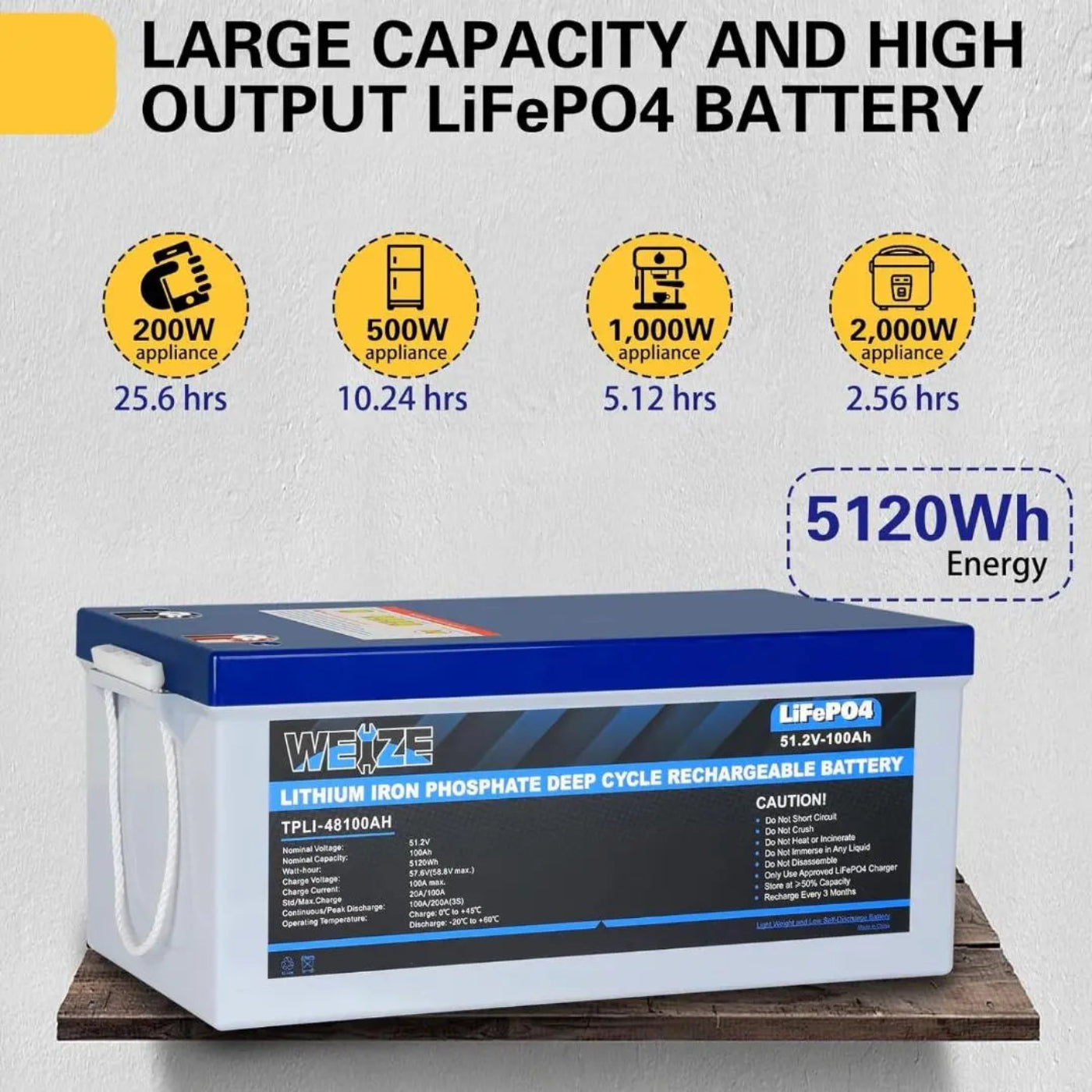Q: What is the WEIZE 48V 100Ah 5120Wh LiFePO4 Lithium Battery?