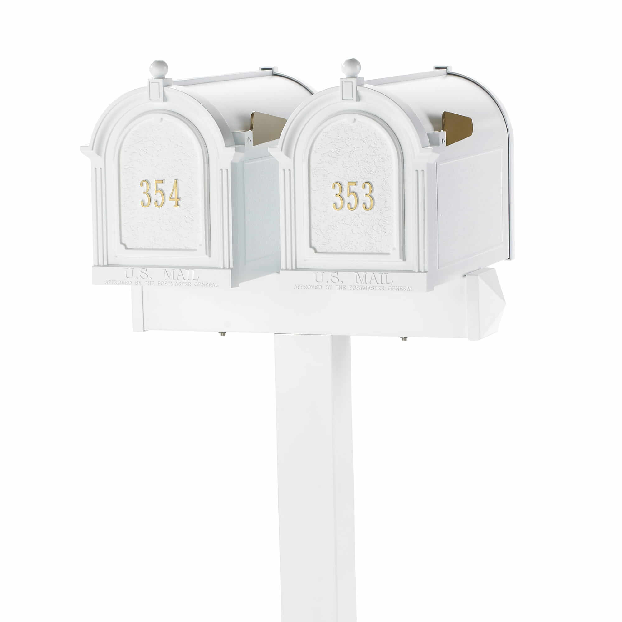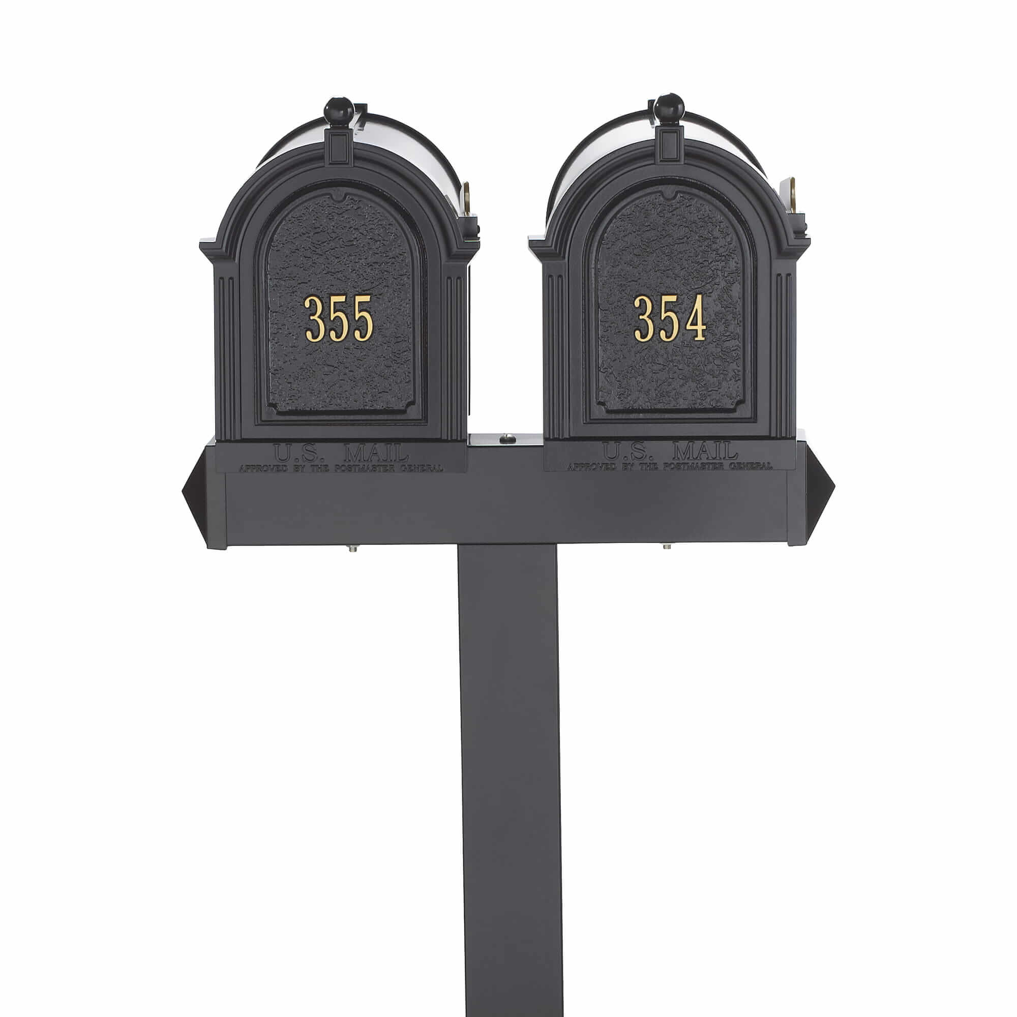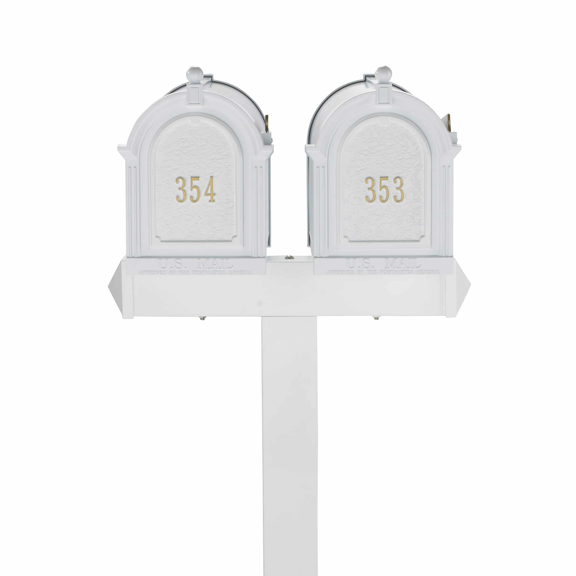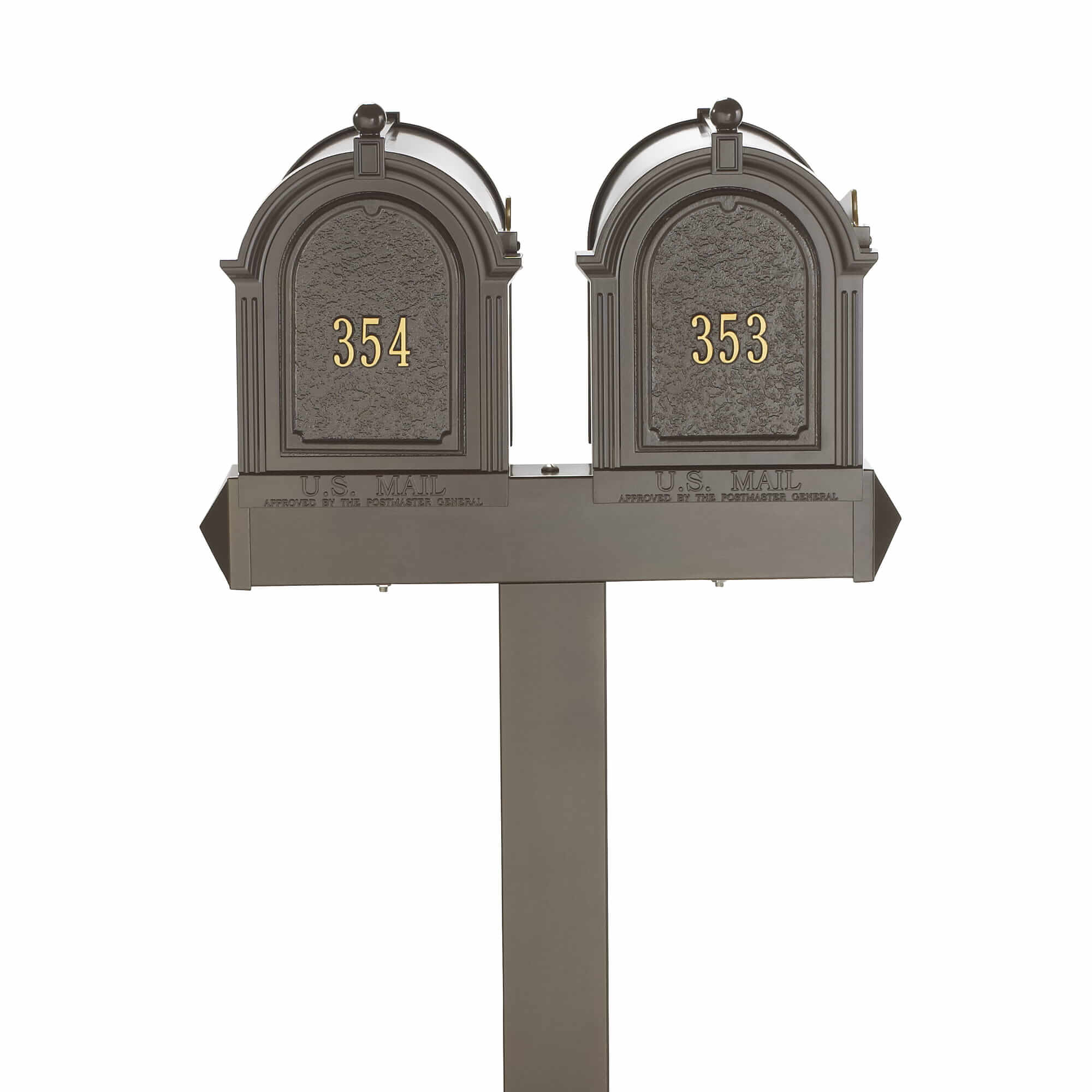 The Whitehall Multi Mailbox Dual Capitol Package with personalized door plaques features the capitol mailbox made from sand cast high-density aluminum is 20% larger than your standard mailbox. Magazines lay flat in the generous interior. This dual mailbox is approved by Postmaster General.