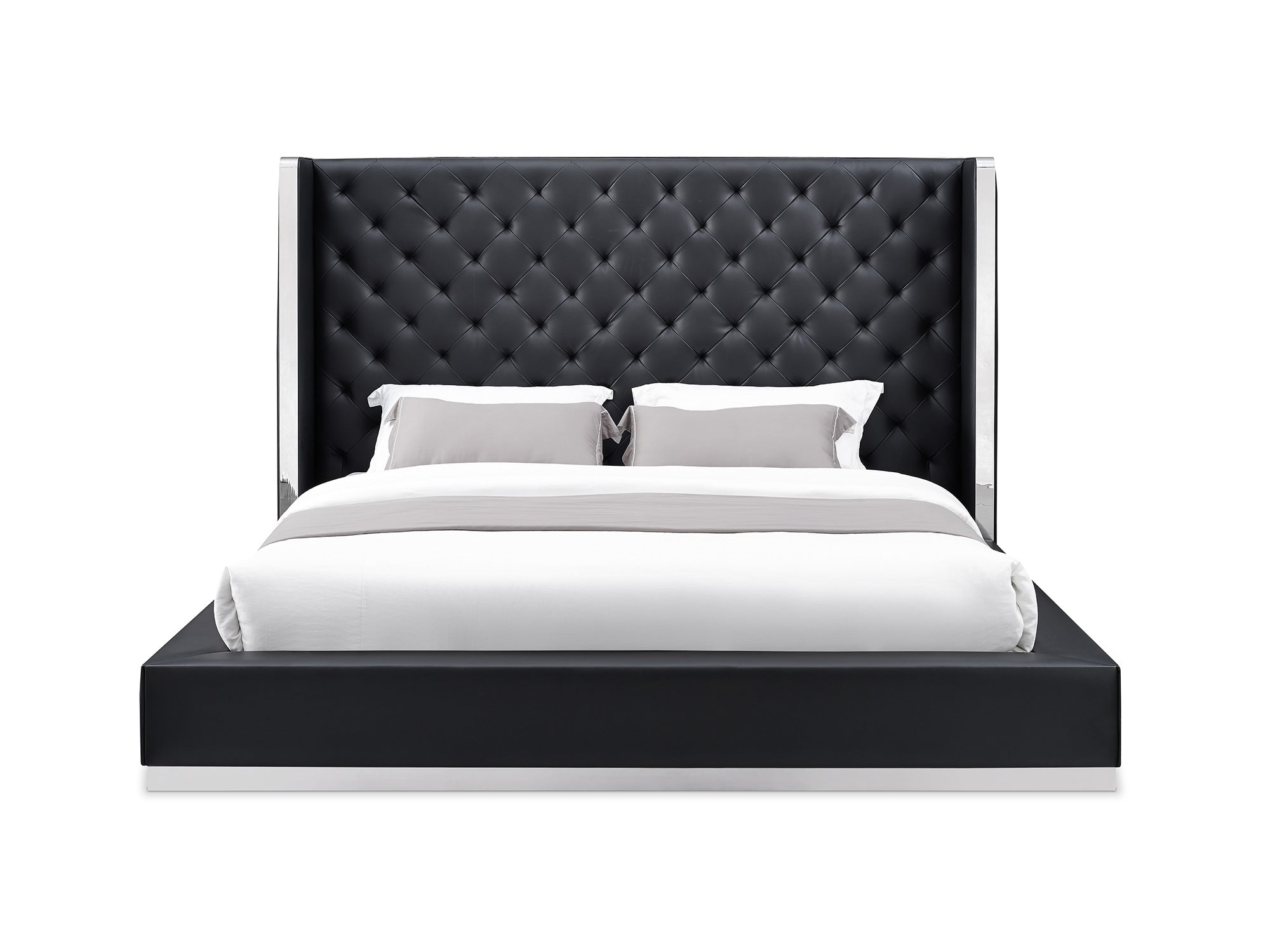 A: This bed features a luxurious black upholstery, a sturdy frame, and a contemporary design, making it a stylish centerpiece for any modern bedroom.
