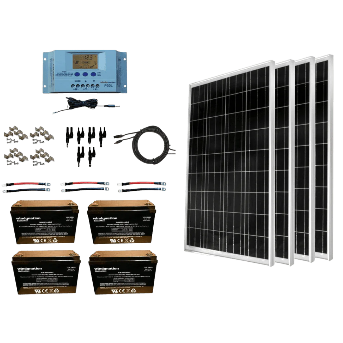 The Windy Nation 400-Watt Complete Solar Charging Kit and 400Ah Battery Bank comes with everything you need to start producing free, clean power from the sun. Perfect for RV's, boats, cabins and back-up power. WindyNation's 400-Watt Solar Kit with batteries includes everything you need to get started: four 100-Watt Polycrystalline Solar Panels, four 100Ah AGM Deep Cycle Batteries with 2/0 AWG Interconnect Cables, 30 Amp P30L Solar Charge Controller, 40 ft. of UL Listed 12 AWG Solar Cable, all necessary MC4 Connectors for wiring and all the necessary mounting hardware. Product photos above show pictures of all the included items and additional technical information. The WindyNation 400-Watt Solar Charging Kit is the ideal solution for providing back-up power or off-grid power when you need it. Solar panels will provide on average 1700 Watt Hours (Wh) or 150 Amp hours of charge per day (depends on sunlight availability)