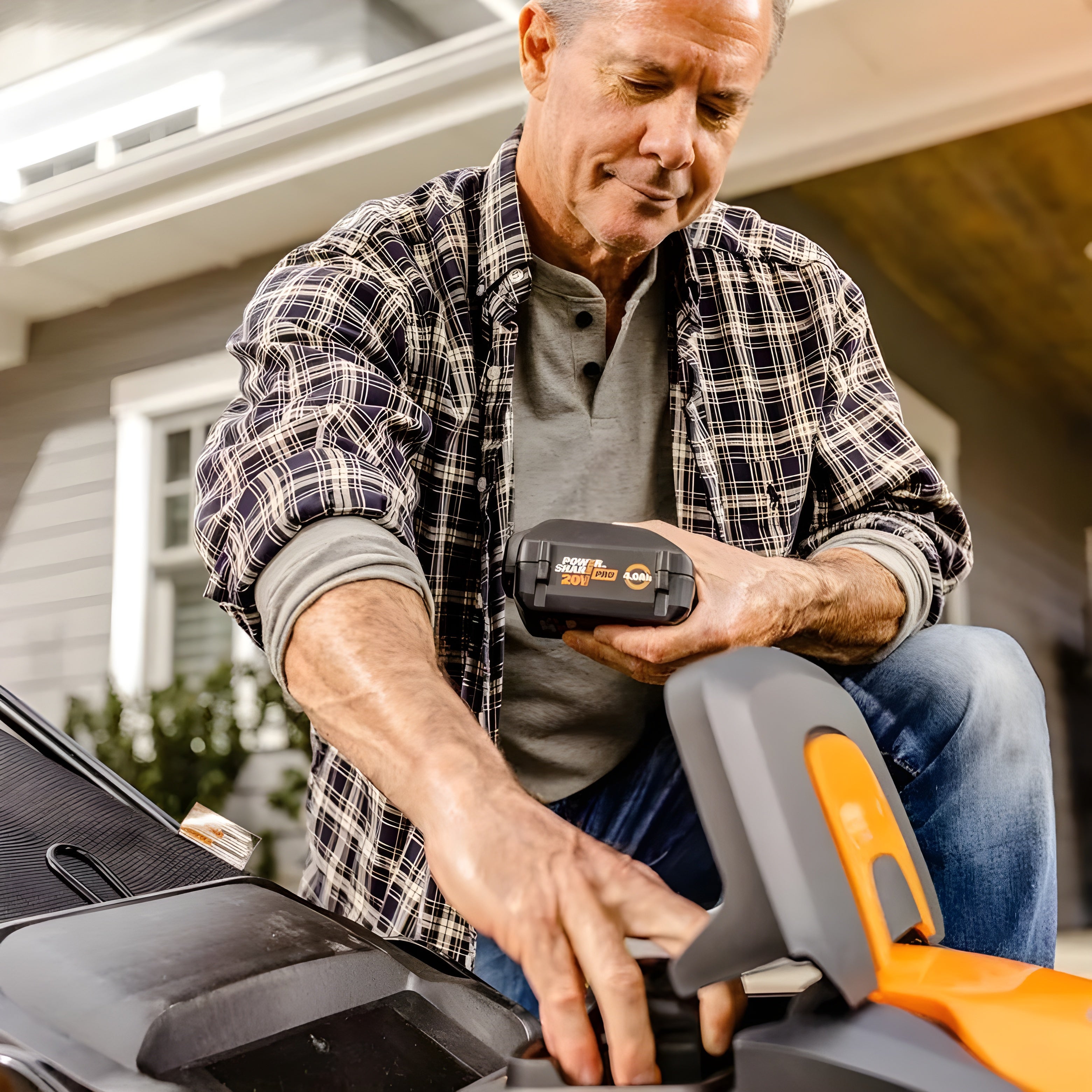 A: It runs on two 20V Power Share batteries, delivering a total of 40V for efficient mowing.