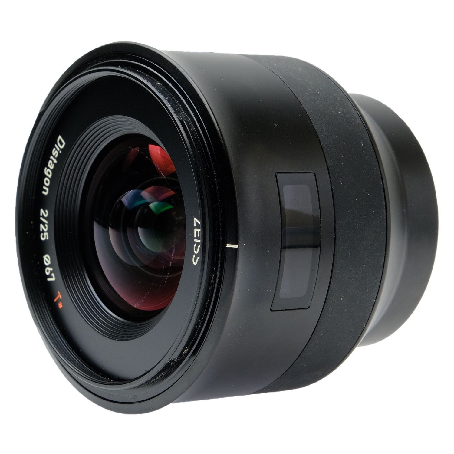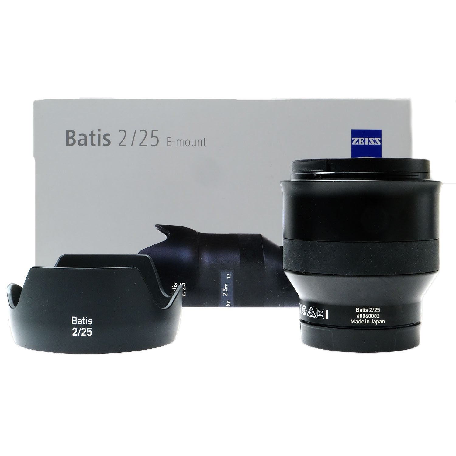 This Zeiss Batis 25mm f2 Distagon T* Lens for Sony E, #60060082, is in great condition with minor handling wear. I rate it cosmetically a (9+). The focus ring is smooth, the autofocus and aperture function properly, and the glass is clean and clear with no haze, marks, or fungus. There are a few faint specks of dust inside, but they do not affect image quality. This lens includes a Zeiss lens hood, front & rear caps, and the original box. There's a large crack in the lens hood that is close to fully breaking, but the hoood is still intact. Please refer to the photos for details.