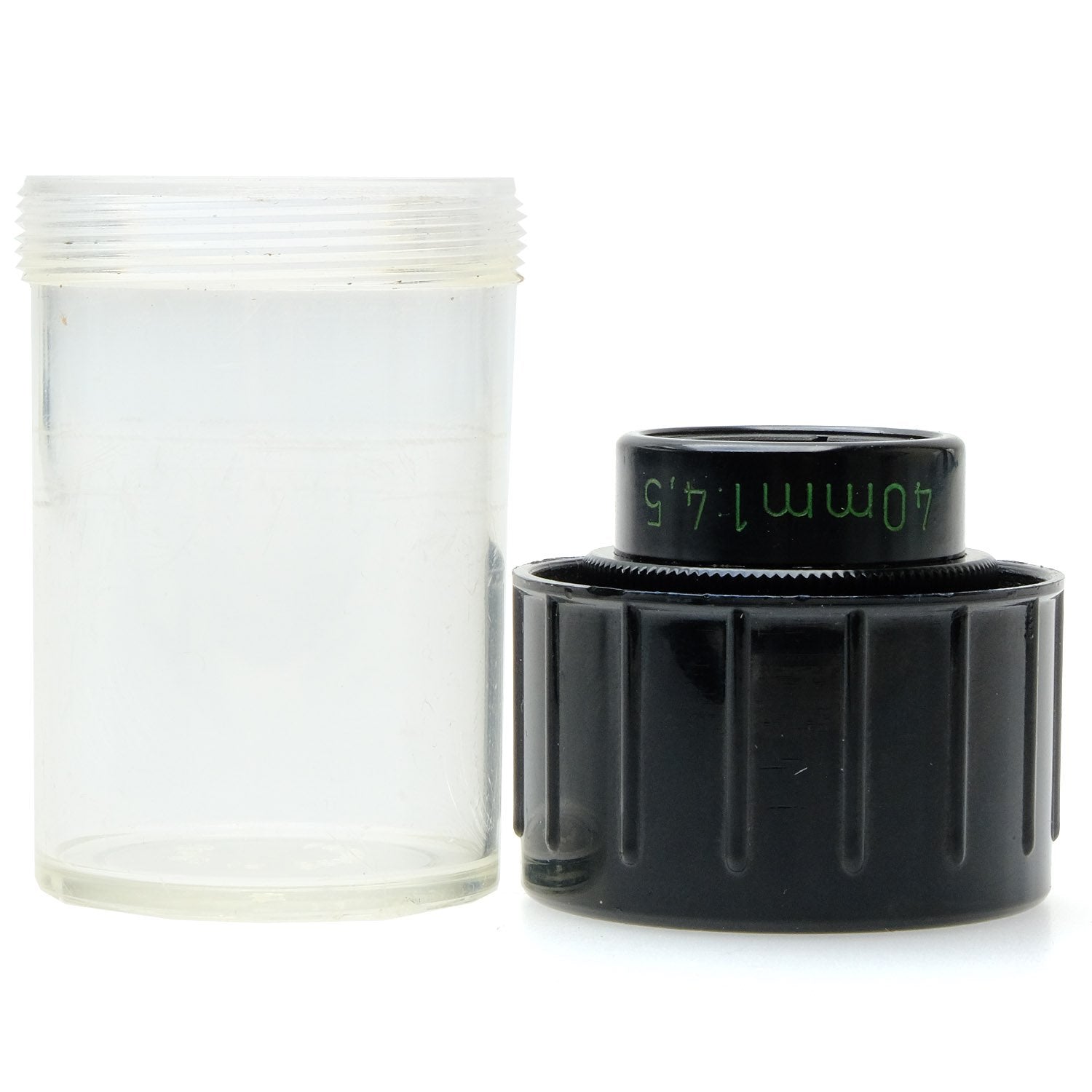 This Zeiss 40mm f4.5 Luminar Macro Lens, #4539079, is in great condition with minor handling wear. I rate it cosmetically a (9). The aperture ring is quite stiff, but the aperture functions properly and the glass is clean and clear with no haze, marks, or fungus. There are a few faint specks of dust inside, but they do not affect image quality. It has coverage up to 4x5" and optimized magnification between 3.5:1 to 12:1. It includes the original case, the top of which functions as a threaded rear cap. Please refer to the photos for details.