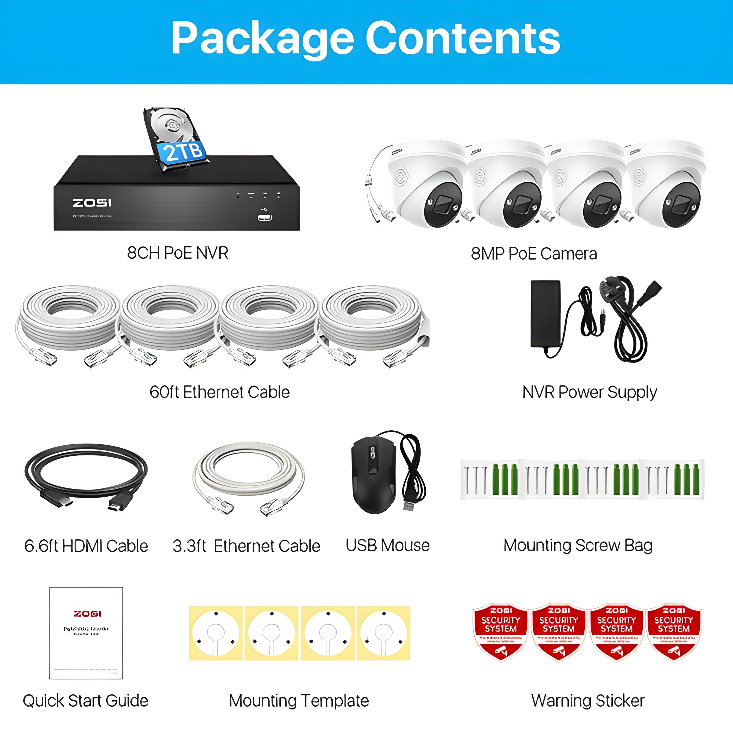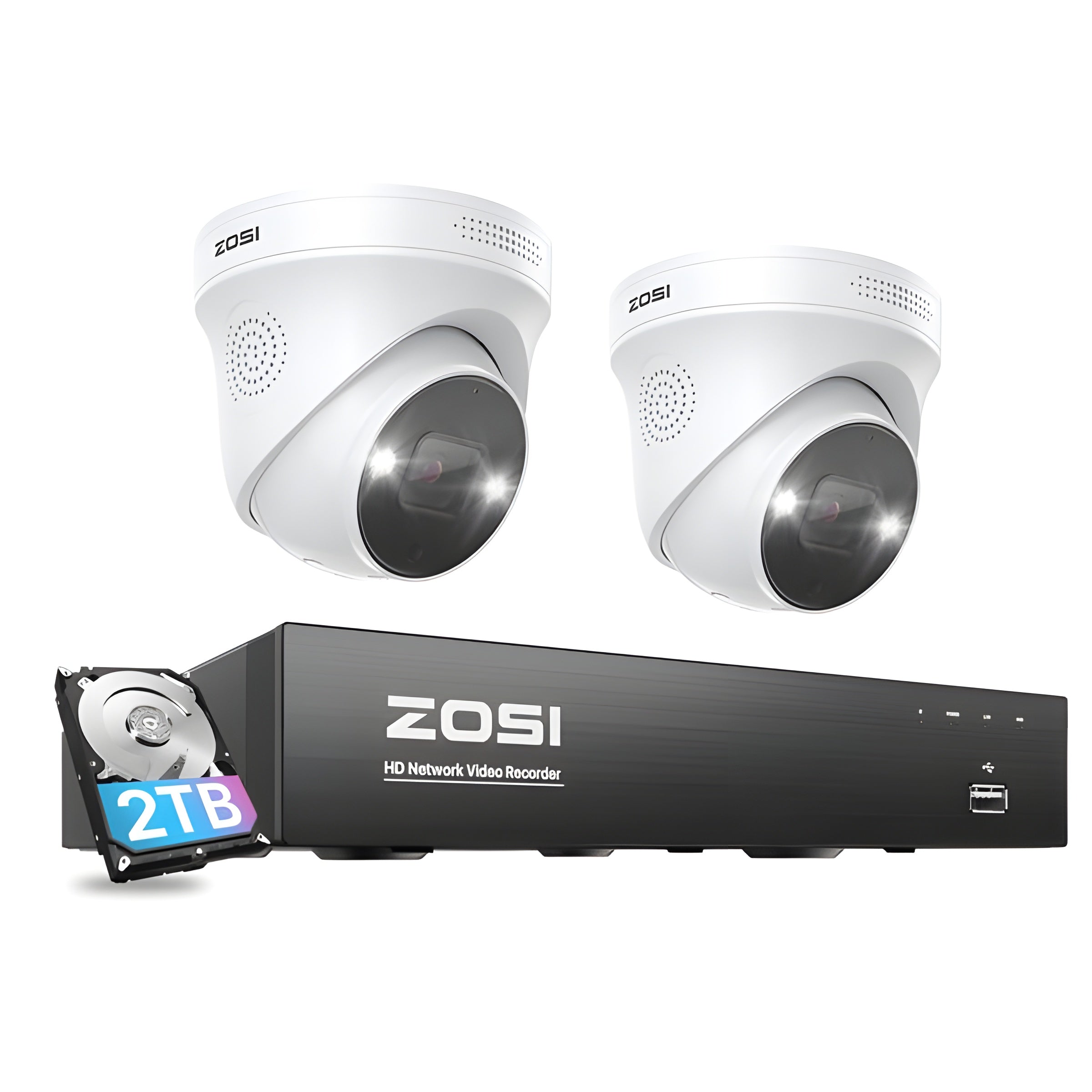A: The Zosi C225 system includes 4K PoE cameras with spotlight-enhanced color night vision, AI-powered person and vehicle detection, and a 2TB hard drive for secure storage. It also features an 8-channel NVR and remote access via the Zosi Smart app.