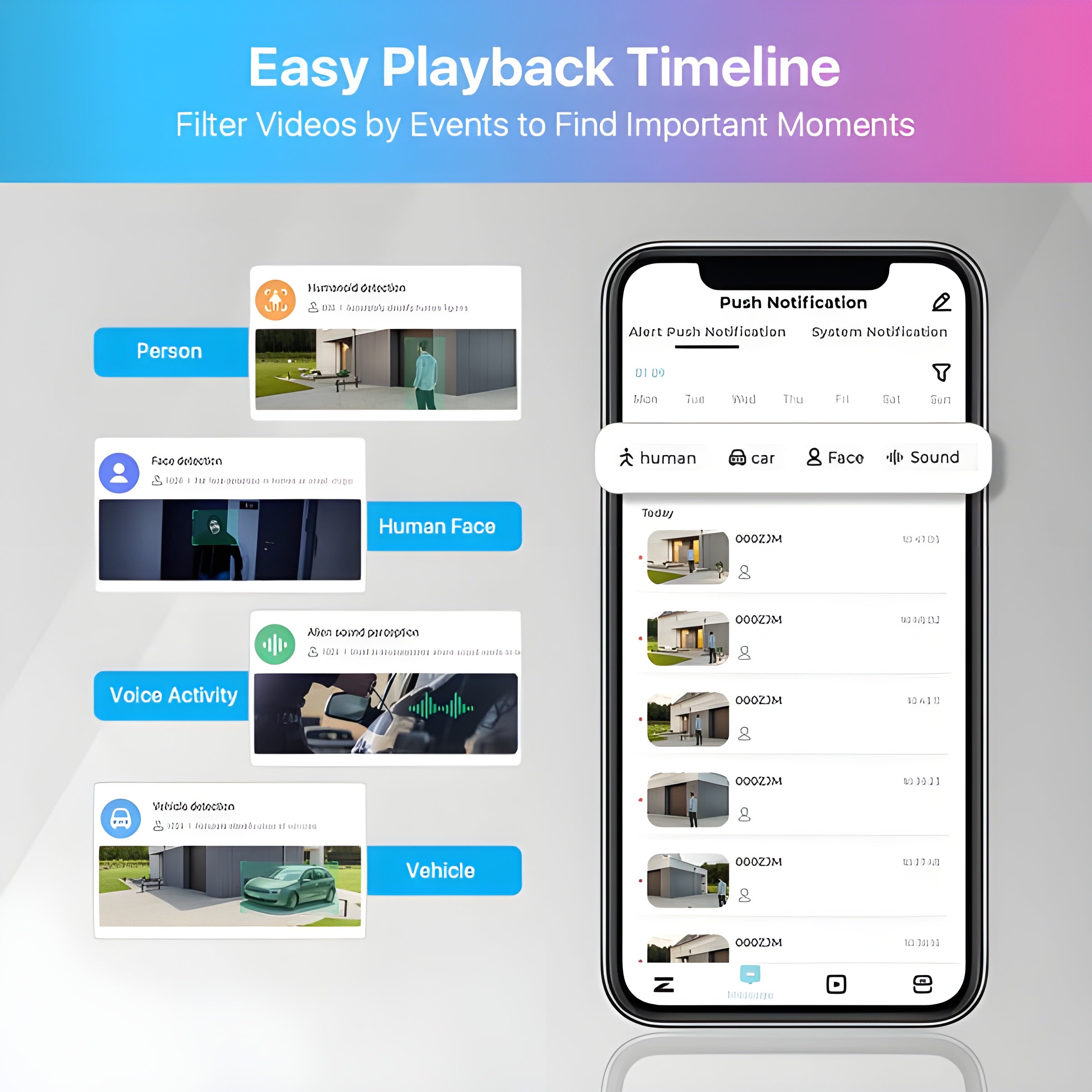 • Live View & Smart Playback: Check what's happening now anytime and anywhere. Quickly filter recorded videos by person/vehicle events.